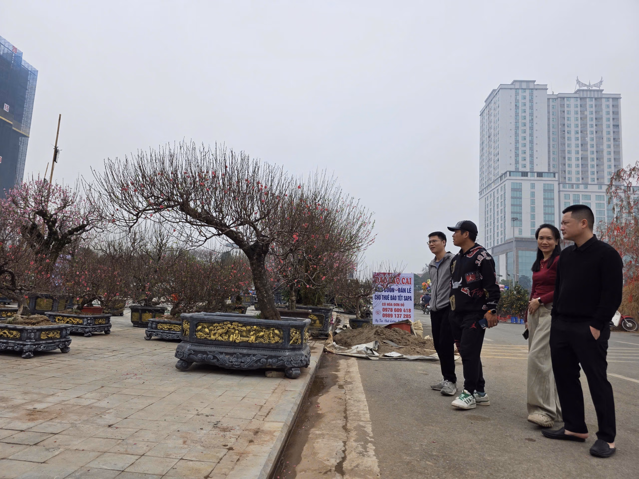 Tại chợ hoa Tết Thanh niên Phú Thọ, không chỉ anh Mạnh, nhiều tiểu thương khác tại đây cũng nhanh chóng bắt nhịp xu hướng bán hàng qua mạng xã hội. Một nữ tiểu thương bán đào bích Nhật Tân cánh kép liên tục livestream, trả lời bình luận khách hỏi giá. Theo giới thiệu, những gốc đào lớn, tán rộng khoảng 3m, cao gần 2,8m có giá từ 26–28 triệu đồng, đã bao gồm chi phí vận chuyển đến một số tỉnh, thành lân cận.