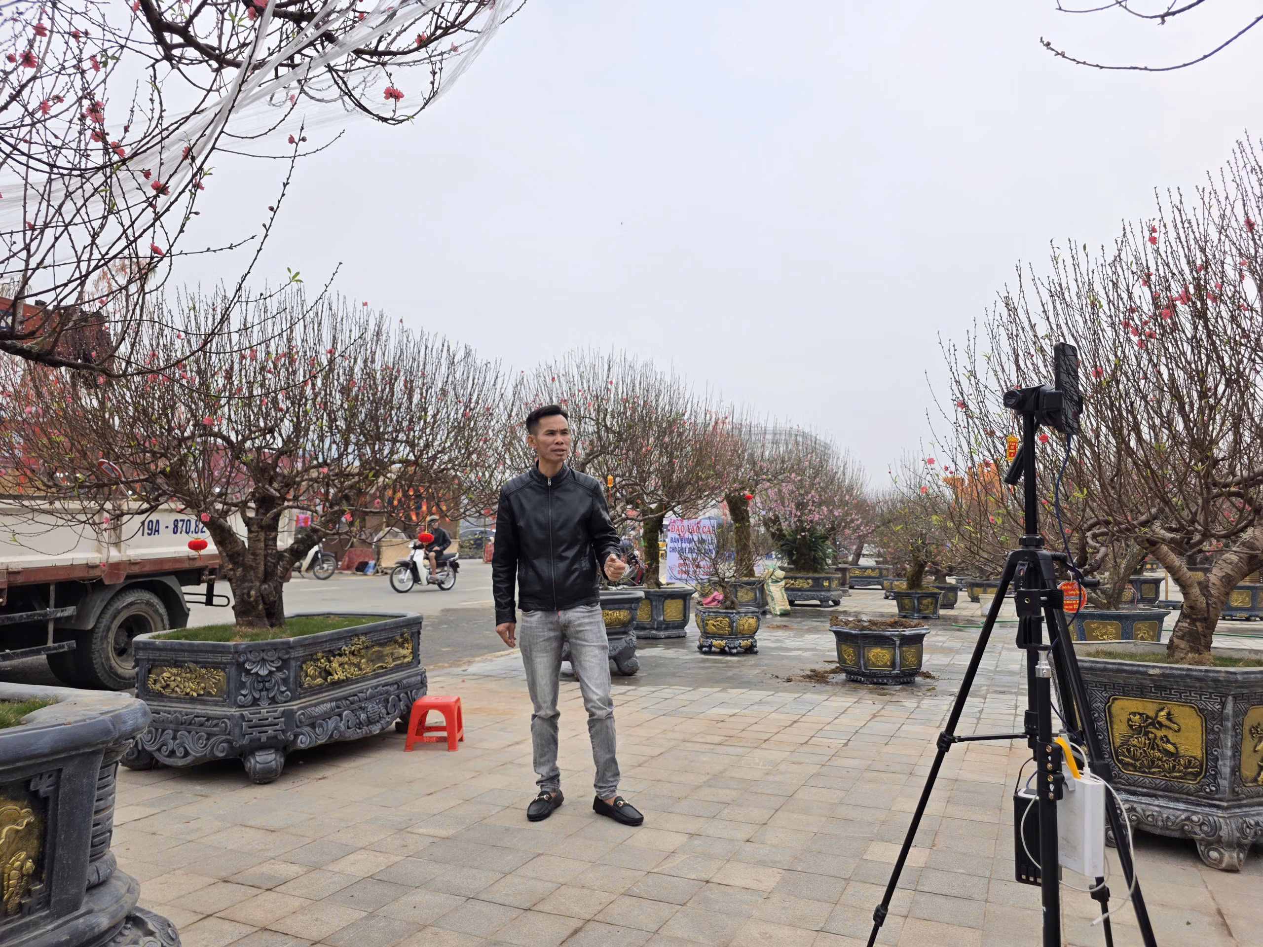 Anh Mạnh, chủ vườn đào Nhật Tân (Hà Nội), mang đến chợ hoa Tết Thanh niên Phú Thọ hàng chục gốc đào với nhiều mức giá. Ngoài bán trực tiếp cho khách tại chợ, anh còn thường xuyên livestream trên kênh TikTok “Bonsai Lão Hạc”. Tại gian hàng, chỉ với một chiếc điện thoại kết nối 4G và giá đỡ đơn giản, anh vừa tư vấn cho khách trực tiếp, vừa trò chuyện, chốt đơn với khách online.
