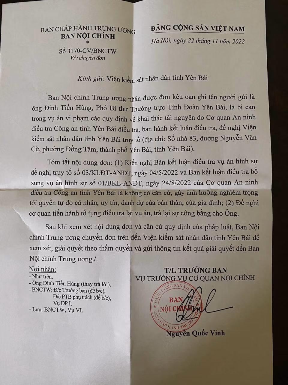 Văn bản của Ban Nội chính Trung ương nêu rõ: Ban Nội chính Trung ương nhận được đơn kêu oan của ông Đinh Tiến Hùng, Phó Bí thư Thường trực Tỉnh Đoàn Yên Bái, là bị can trong vụ án vi phạm các quy định về khai thác tài nguyên do Cơ quan An ninh điều tra Công an tỉnh Yên Bái điều tra, ban hành kết luận điều tra, đề nghị Viện kiểm sát nhân dân tỉnh Yên Bái truy tố.