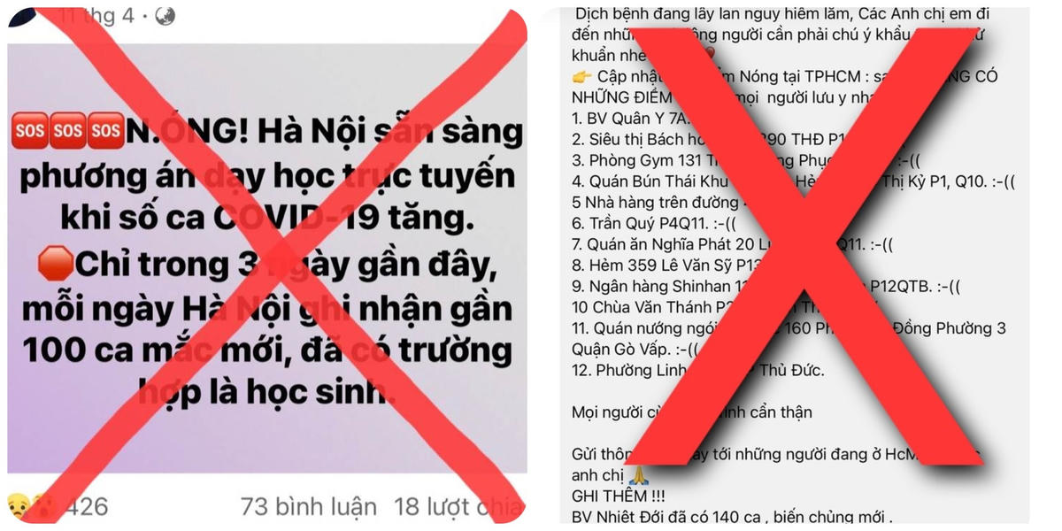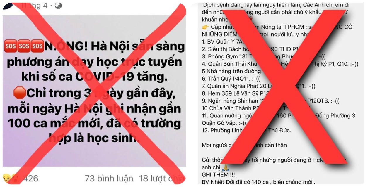 Mới đây nhất có thể kể đến thông tin "Cập nhật 12 điểm nóng tại TP HCM" hay "Hà Nội sẵn sàng phương án dạy học trực tuyến khi có học sinh mắc Covid-19" là những thông tin sai sự thật đã được lan truyền. Ngay sau khi xuất hiện những thông tin này, Sở Y tế TP HCM và Sở Giáo dục và Đào tạo TP Hà Nội đã tức tốc có thông báo bác bỏ.