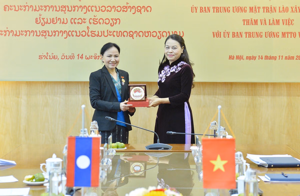 Sáng 14/11, tại Hà Nội, Ủy viên Trung ương Đảng, Phó Chủ tịch - Tổng Thư ký Ủy ban Trung ương MTTQ Việt Nam Nguyễn Thị Thu Hà đã thân mật tiếp đoàn đại biểu Ủy ban Trung ương Mặt trận Lào xây dựng đất nước do bà Inlavanh Keobounphanh, Ủy viên Trung ương Đảng Nhân dân Cách mạng Lào, Phó Chủ tịch Ủy ban Trung ương Mặt trận Lào xây dựng đất nước làm Trưởng đoàn đến thăm và làm việc với Ủy ban Trung ương MTTQ Việt Nam.