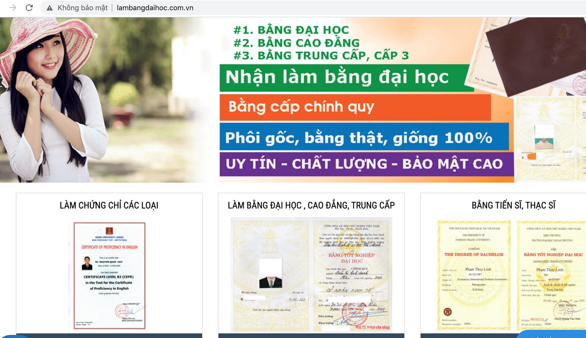 Còn tại trang “lambanggia.net” quảng cáo làm bằng tiến sĩ với những lời có cánh “Làm bằng tiến sĩ không cần đặt cọc giá rẻ phôi gốc thật 100%, mộc đóng và mộc giáp lai giống thật 100%, tem 7 màu 6 cánh của Bộ Giáo dục và Đào tạo, làm xong giao bằng nhận tiền không cần đặt cọc”. Khi chúng tôi liên hệ, một người xưng tên Minh ra giá: “Bằng tiến sĩ làm giá 8 triệu đồng. Muốn trường nào gửi mẫu làm cho”.