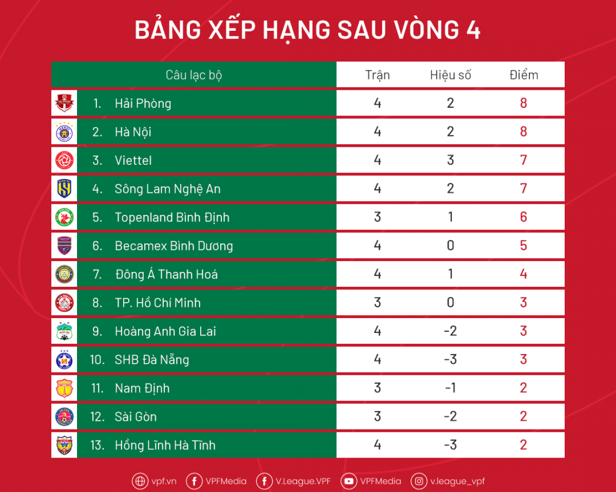 Bảng xếp hạng V-League 2022 mới nhất: Hải Phòng đứng nhất bảng Thứ Hai 27/06/2022 07:13 (GMT+7) Cập nhật bảng xếp hạng V-League 2022 sau vòng 4, Tuyển Hải Phòng đứng nhất bảng, Hà Nội cùng 8 điểm đứng thứ 2, Viettel 7 điểm đứng thứ 3. B.Phúc (tổng hợp)