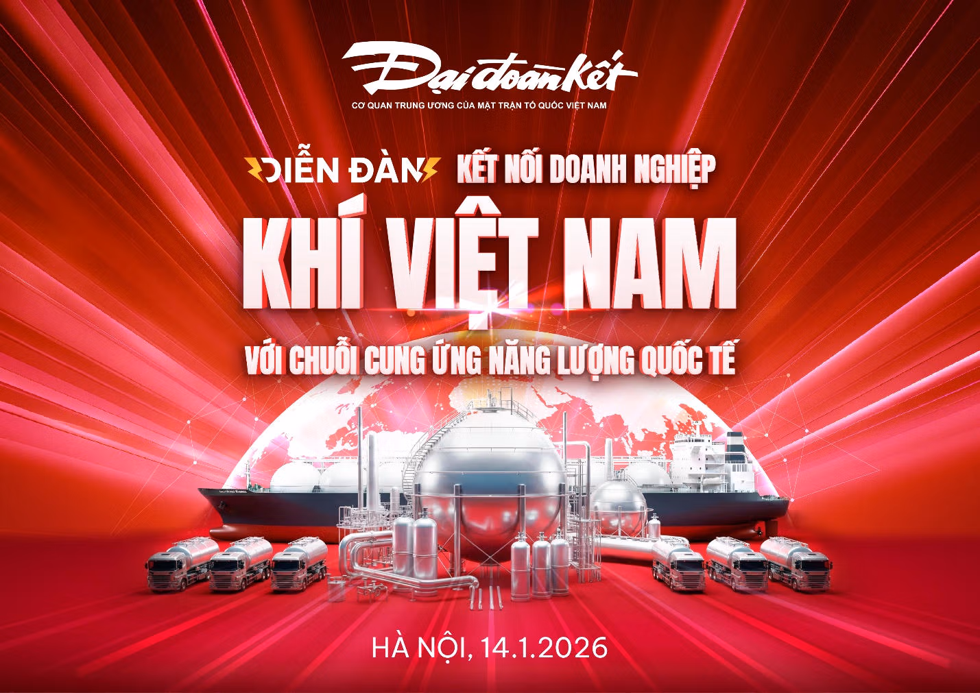 Xuất phát từ yêu cầu đó, Báo Đại đoàn kết phối hợp cùng với các đối tác tổ chức diễn đàn "Kết nối doanh nghiệp khí Việt Nam với chuỗi cung ứng năng lượng quốc tế" là hết sức cần thiết và ý nghĩa. Diễn đàn dự kiến sẽ được tổ chức sáng ngày 14/1/2026 tại khách sạn Du Parc (Hà Nội) nhằm tạo không gian để các nhà hoạch định chính sách, chuyên gia, doanh nghiệp và cộng đồng cùng thảo luận, trao đổi thông tin, cùng tìm kiếm những hướng đi, giải pháp thúc đẩy sự phát triển của thị trường khí LNG tại Việt Nam nói riêng và hướng đi giúp doanh nghiệp khí Việt Nam vươn mình ra thị trường quốc tế.