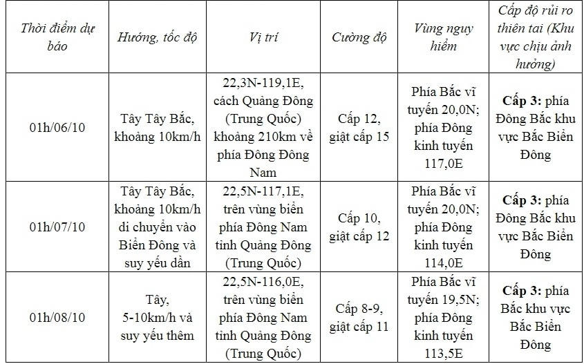 Theo Trung tâm dự báo khí tượng thủy văn Quốc gia, hồi 1 giờ ngày 5/10, vị trí tâm bão ở vào khoảng 22,0 độ Vĩ Bắc; 121,2 độ Kinh Đông, trên vùng biển phía Đông Nam đảo Đài Loan (Trung Quốc). Sức gió mạnh nhất vùng gần tâm bão mạnh cấp 14 (150-166km/h), giật cấp 17, di chuyển theo hướng Tây, tốc độ khoảng 15km/h.