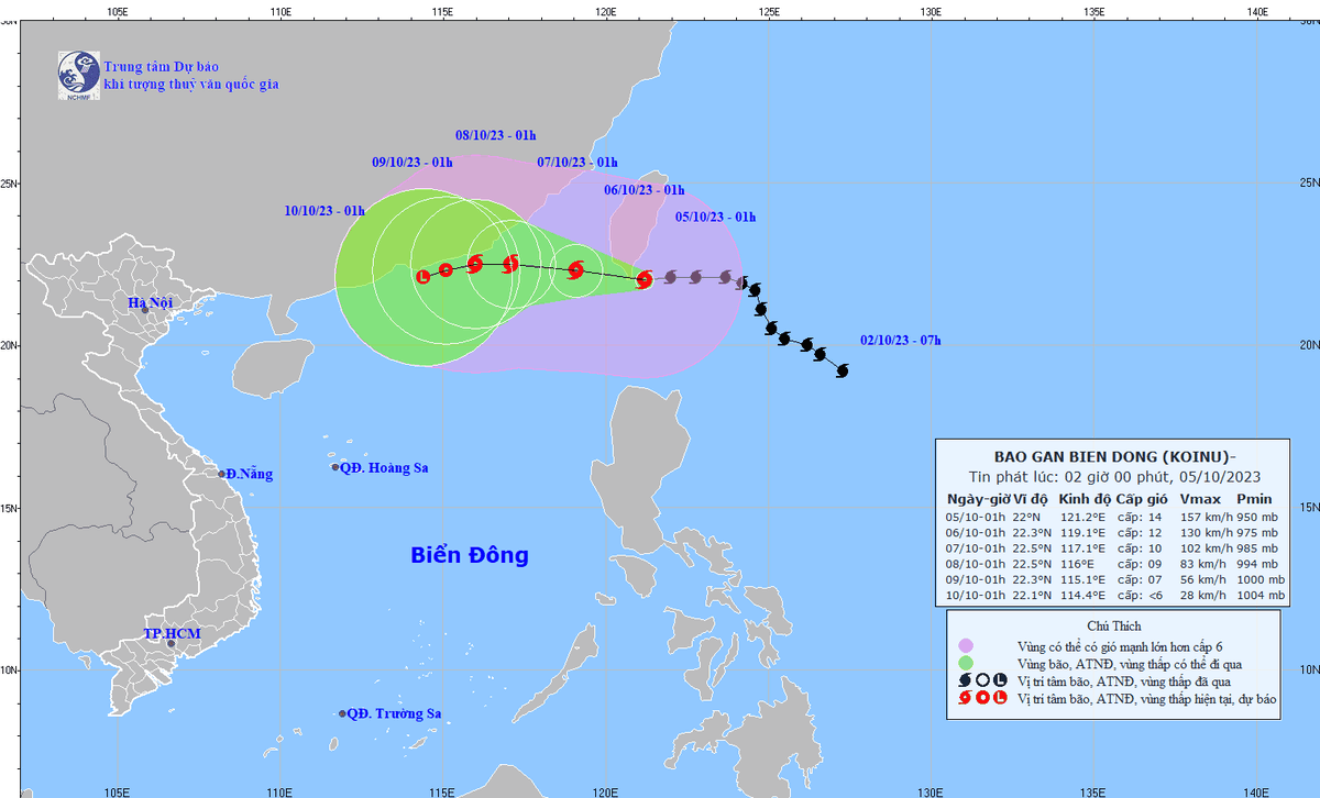 Bão KOINU với sức gió mạnh nhất vùng gần tâm bão mạnh cấp 14 (150-166km/h), giật cấp 17, di chuyển theo hướng Tây, tốc độ khoảng 15km/h.