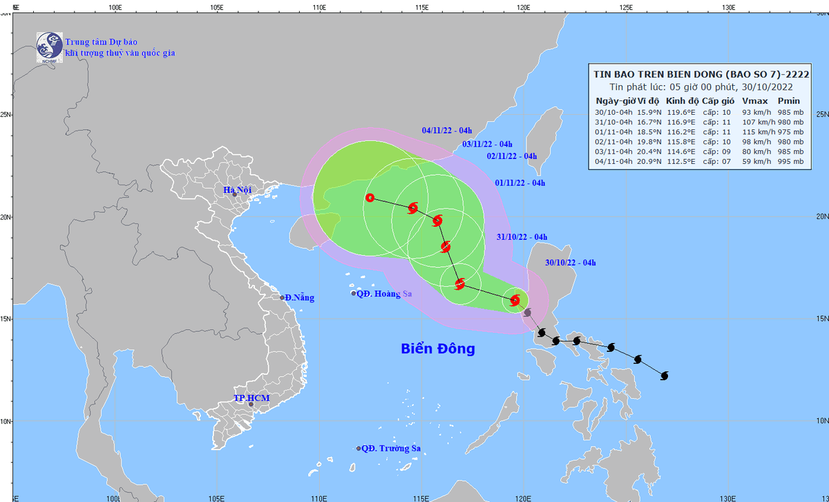 Theo Trung tâm Dự báo khí tượng thủy văn quốc gia, sáng sớm 30/10, bão Nalgae đã vượt qua khu vực phía Nam của đảo Luzon Philippines đi vào Biển Đông, trở thành bão số 7 năm 2022.
