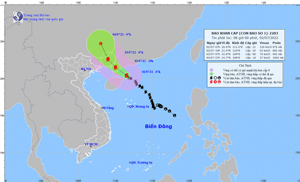 Trung tâm Dự báo Khí tượng Thủy văn Quốc gia cảnh báo vùng biển phía Tây Bắc khu vực Bắc Biển Đông ngày 2/7 có gió mạnh cấp 9 - 10, vùng gần tâm bão mạnh cấp 10 - 11, giật cấp 14; sóng biển cao từ 6 - 8 m, biển động dữ dội.