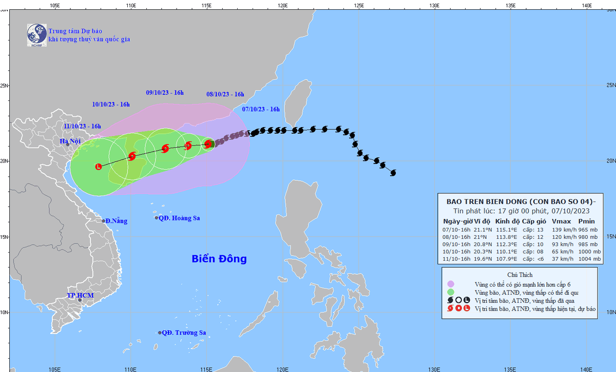 Trong suốt sáng nay (7/10), bão số 4 gần như ít dịch chuyển, duy trì cường độ của một cơn bão rất mạnh và có khả năng cao tiến về vịnh Bắc Bộ trong những ngày tới.