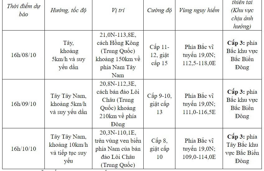 Hồi 16 giờ ngày 7/10, vị trí tâm bão ở vào khoảng 21,1 độ Vĩ Bắc; 115,1 độ Kinh Đông, cách Hồng Kông (Trung Quốc) khoảng 150km về phía Nam Đông Nam. Sức gió mạnh nhất vùng gần tâm bão mạnh cấp 13 (134-149km/h), giật cấp 16, di chuyển chậm theo hướng Tây với tốc độ khoảng 5km/h.