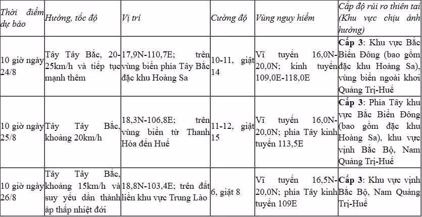 Theo Trung tâm Khí tượng thủy văn quốc gia, hồi 12h ngày 23/8 vị trí tâm bão ở khoảng 17.4 độ Vĩ Bắc; 115.2 độ Kinh Đông, cách đặc khu Hoàng Sa khoảng 320km về phía Đông Đông Bắc. Sức gió mạnh nhất cấp 9 (75-88km/h), giật cấp 11. Dự báo trong 3 giờ tới, bão di chuyển theo hướng Tây Tây Bắc, tốc độ khoảng 25km/h.
