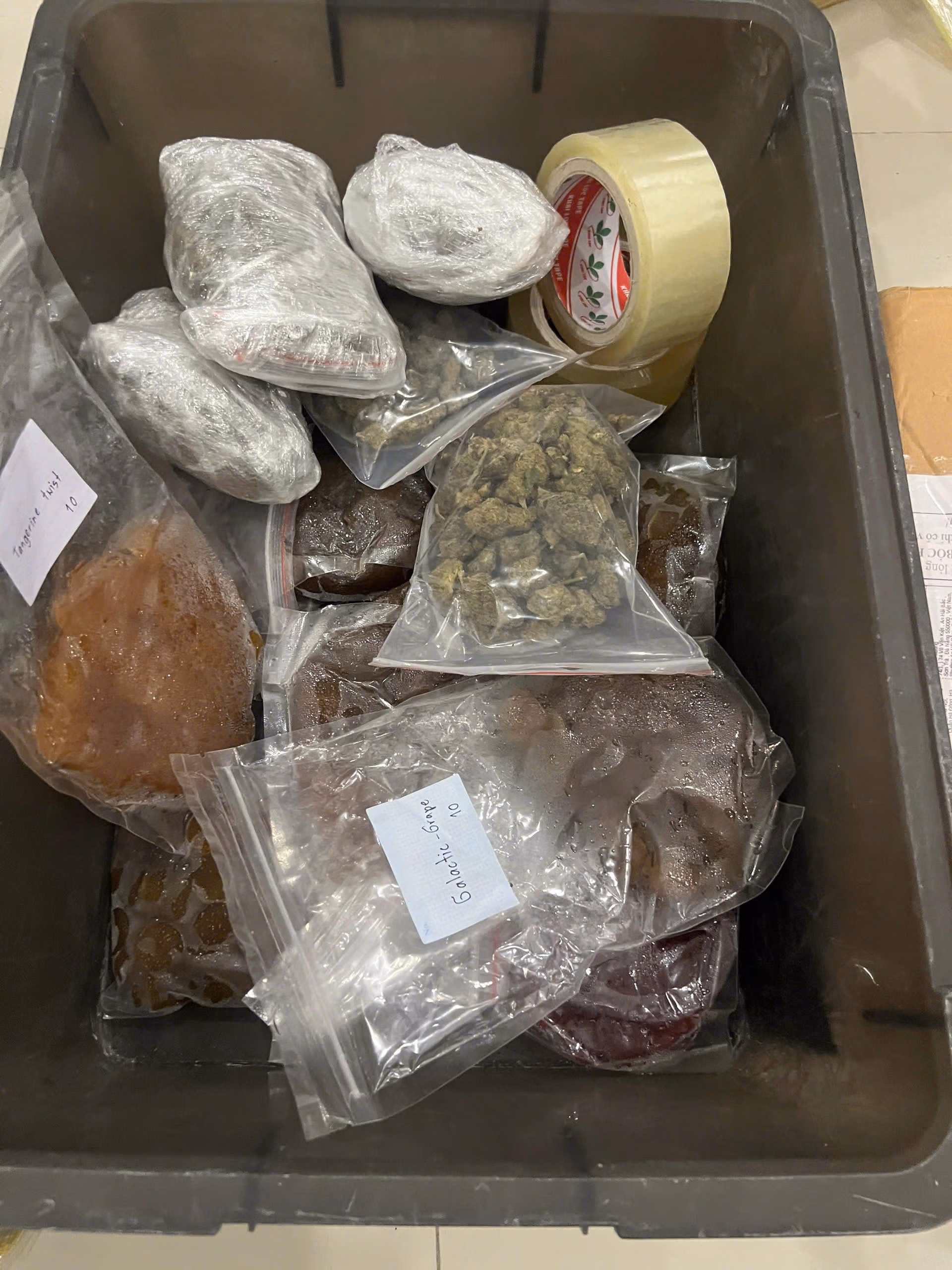 Tang vật thu giữ tại hiện trường gồm một gói tinh thể màu trắng nghi là ma túy Ketamine và 20 viên nén màu hồng nghi là ma túy tổng hợp.