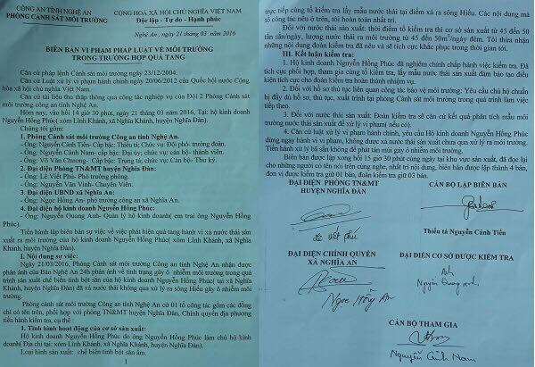 Trước phản ánh của cử tri và dư luận, nhiều lần cơ quan chức năng cũng đã tiến hành kiểm tra và xử phạt. Tuy nhiên, không hiểu vì sao, xưởng chế biến này vẫn cứ “vô tư” tồn tại? Cụ thể, vào tháng 3/2016, Phòng Cảnh sát môi trường, Công an tỉnh Nghệ An đã tiến hành kiểm tra và lập “Biên bản vi phạm pháp luật về môi trường trong trường hợp bắt quả tang” đối với xưởng chế biến tinh bột sắn do ông Nguyễn Hồng Phúc làm chủ này. Thời điểm đó, qua biên bản làm việc, Phòng Cảnh sát môi trường phát hiện phía sau hệ thống đập bột có 1 bãi tập kết bã sắn. Nước thải từ quá trình sản xuất được thu gom vào các hồ chứa rồi chảy ra sông Hiếu…