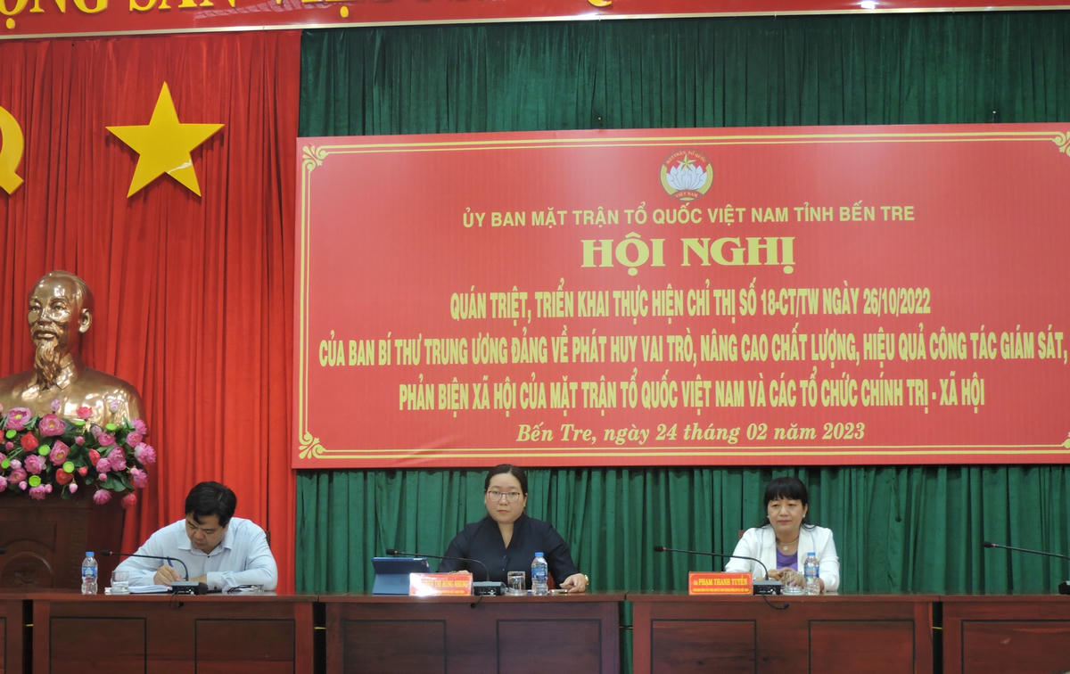 Trong khi đó, bà Nguyễn Thị Hồng Nhung, Chủ tịch Uỷ ban MTTQ Việt Nam tỉnh Bến Tre cho rằng, công tác triển khai, quán triệt các văn bản của Đảng là việc làm quan trọng đối với MTTQ Việt Nam và các tổ chức chính trị - xã hội. Sự ra đời của Chỉ thị 18-CT/TW ngày 26/10/2022 của Ban Bí thư Trung ương Đảng về phát huy vai trò, nâng cao chất lượng, hiệu quả công tác giám sát, phản biện xã hội của MTTQ Việt Nam và các tổ chức chính trị - xã hội là văn bản rất quan trọng để MTTQ, các tổ chức chính trị - xã hội dưới sự lãnh đạo của cấp ủy các cấp triển khai đúng vai trò, nhiệm vụ của mình, tiếp tục củng cố xây dựng lòng tin của nhân dân vào sự lãnh đạo của Đảng, sự quản lý, điều hành của Nhà nước, vai trò tích cực trong tuyên truyền, vận động tham gia của MTTQ, các tổ chức chính trị - xã hội, các đơn vị thành viên.