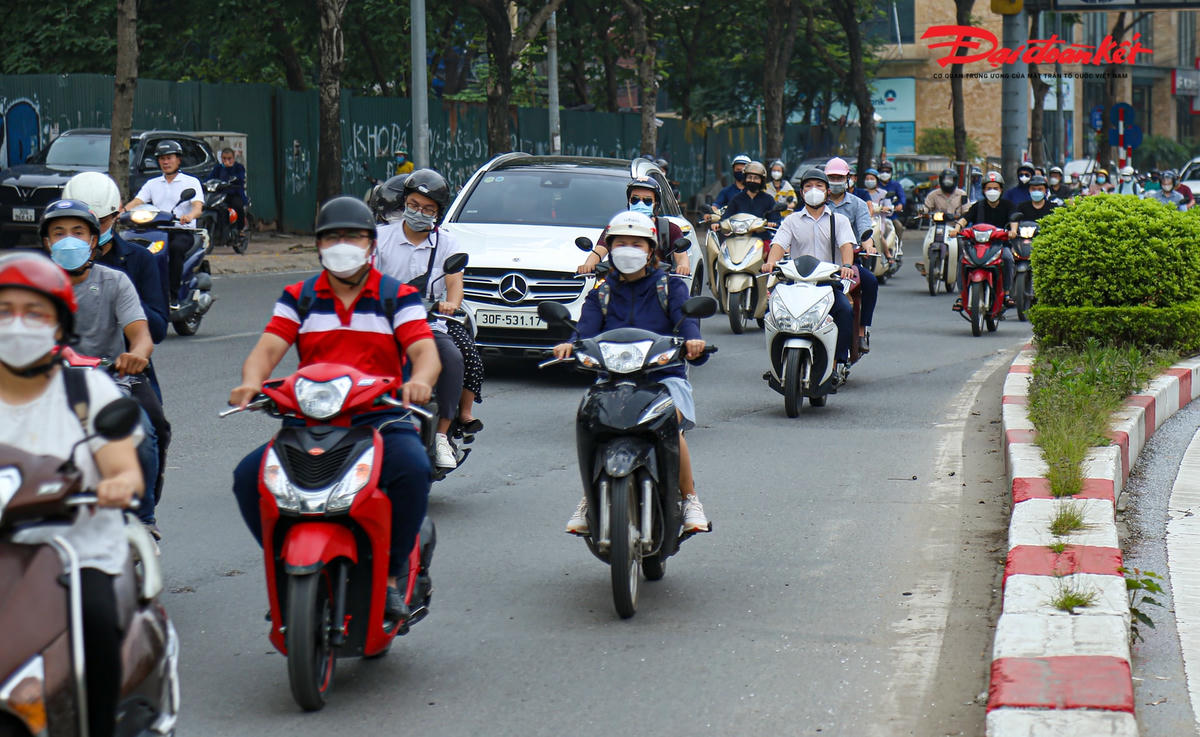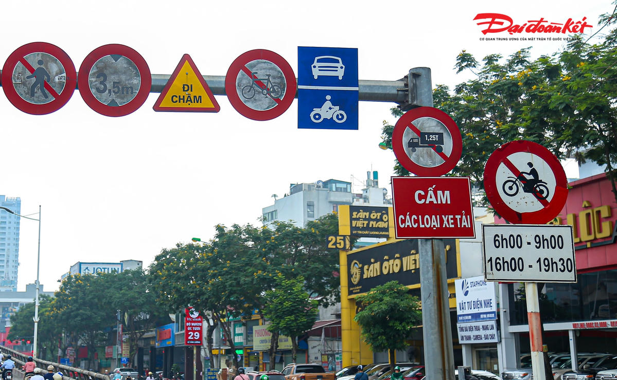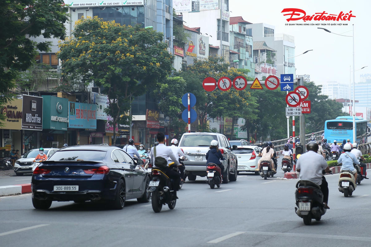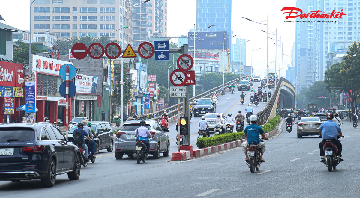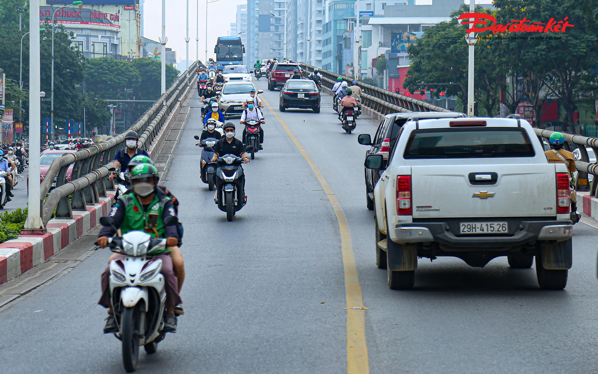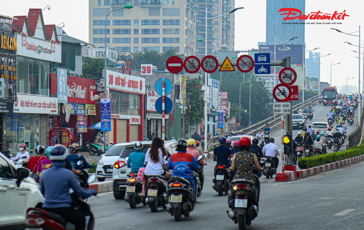 Biển cấm xe máy di chuyển vào giờ cao điểm ở cầu vượt Lê Văn Lương – Láng Hạ chỉ để 'làm cảnh'