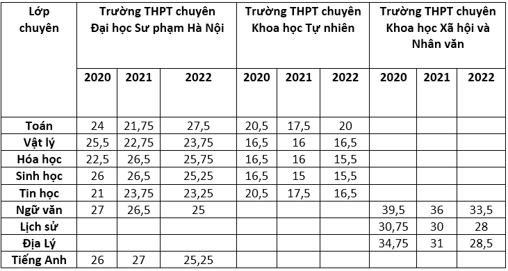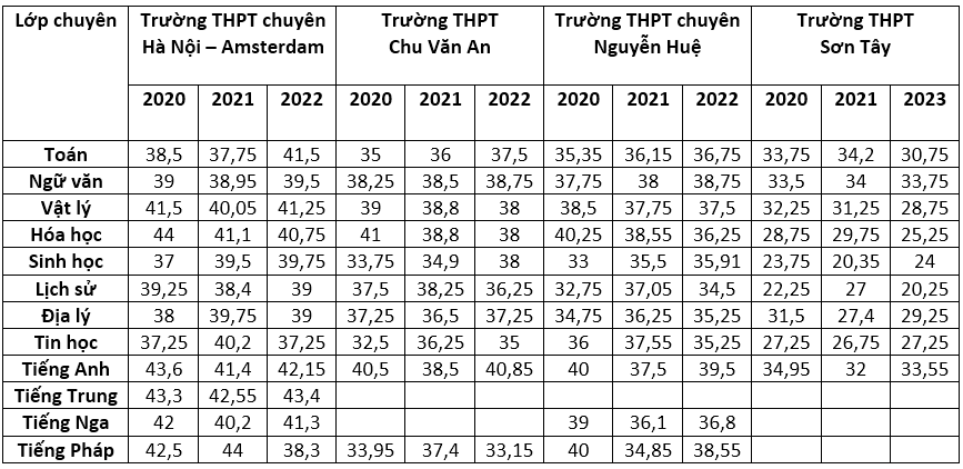 Dưới đây là điểm chuẩn của các trường chuyên trực thuộc Sở GDĐT Hà Nội trong 3 năm qua do PV Báo Đại Đoàn Kết tổng hợp. Thí sinh cần nắm điểm chuẩn của các trường trong những năm qua để cân nhắc chọn trường phù hợp.