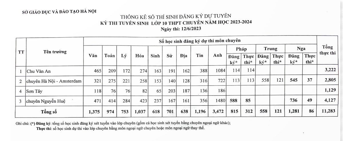 Năm học 2023 - 2024, Hà Nội có 11.283 thí sinh đăng ký dự thi lớp 10 chuyên, trong đó đông nhất là số thí sinh đăng ký vào lớp 10 Trường THPT chuyên Nguyễn Huệ với 4.127 thí sinh.