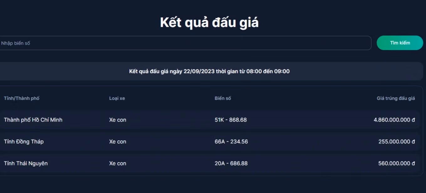 Trước đó, Báo Đại Đoàn Kết đã đưa tin trong phiên đấu giá từ 8h đến 9h sáng 21/9 lần lượt 3 biển số đã được đấu giá gồm: 68A-299.99 trúng đấu giá với mức tiền 2,55 tỷ đồng; 20A-688.88 trúng đấu giá với mức tiền 1,2 tỷ đồng; 49A-599.99 trúng đấu giá với mức tiền 640 triệu đồng.