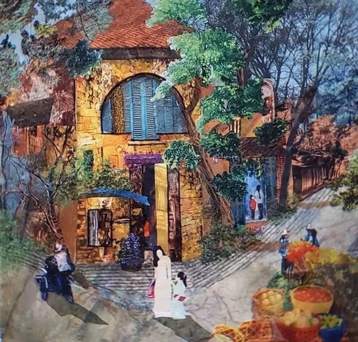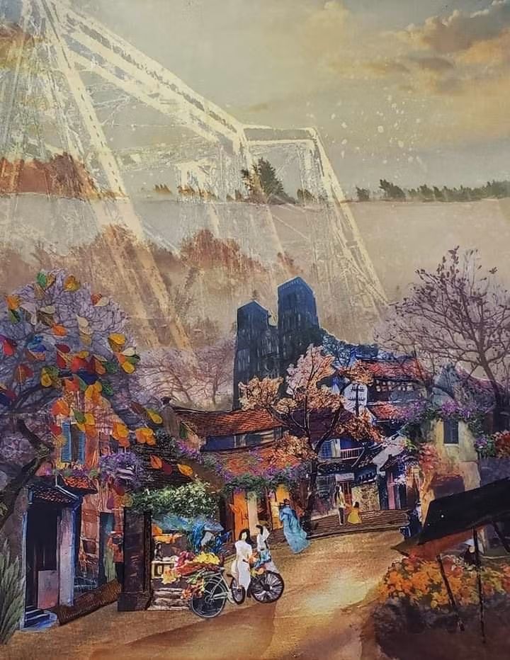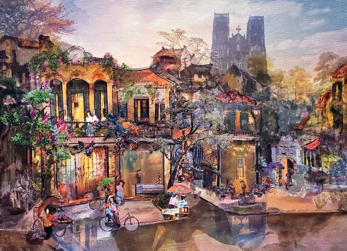 Như tác phẩm “Cho mãi một tình yêu Hà Nội” (125x60cm) hiện ra cổng đền Ngọc Sơn với hai mẹ con mặc áo dài đỏ chờ bác xích lô đến đón, xa xa là Tháp Rùa… Hay tác phẩm “Những ô cửa hình ánh sáng” cũng kích thước lớn, dựng lên nhịp điệu cuộc sống lúc chạng vạng ở một góc phố rất đẹp của Hà Nội. Còn tác phẩm “Sáng chớm lạnh trong lòng Hà Nội”, hay “Một thời đạn bom một thời hòa bình” cũng vậy. Bàn tay tỉ mỉ của người họa sĩ đã tạo nên tác phẩm từ hàng vạn họa tiết vải, thậm chí cả vụn vải để tạo nên hòa sắc cho bức tranh…