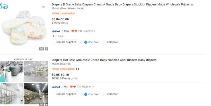 Tuy nhiên, tìm kiếm tên những thương hiệu bỉm như Supdry, Mijuki, Nanu trên các trang thương mại điện tử phổ biến của Trung Quốc như Taobao, Alibaba,... đều không thấy. Thay vào đó là những “lời chào” gia công bỉm giá rẻ của các xưởng sản xuất ở Quảng Châu, Phúc Kiến với giá chỉ từ 0,02 - 0,1 USD/chiếc (400 đến 2.000/chiếc).