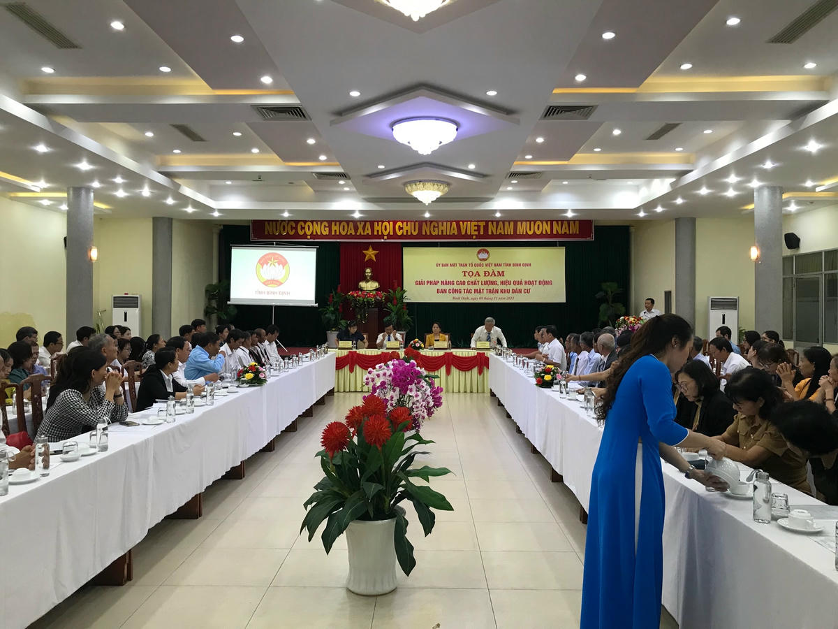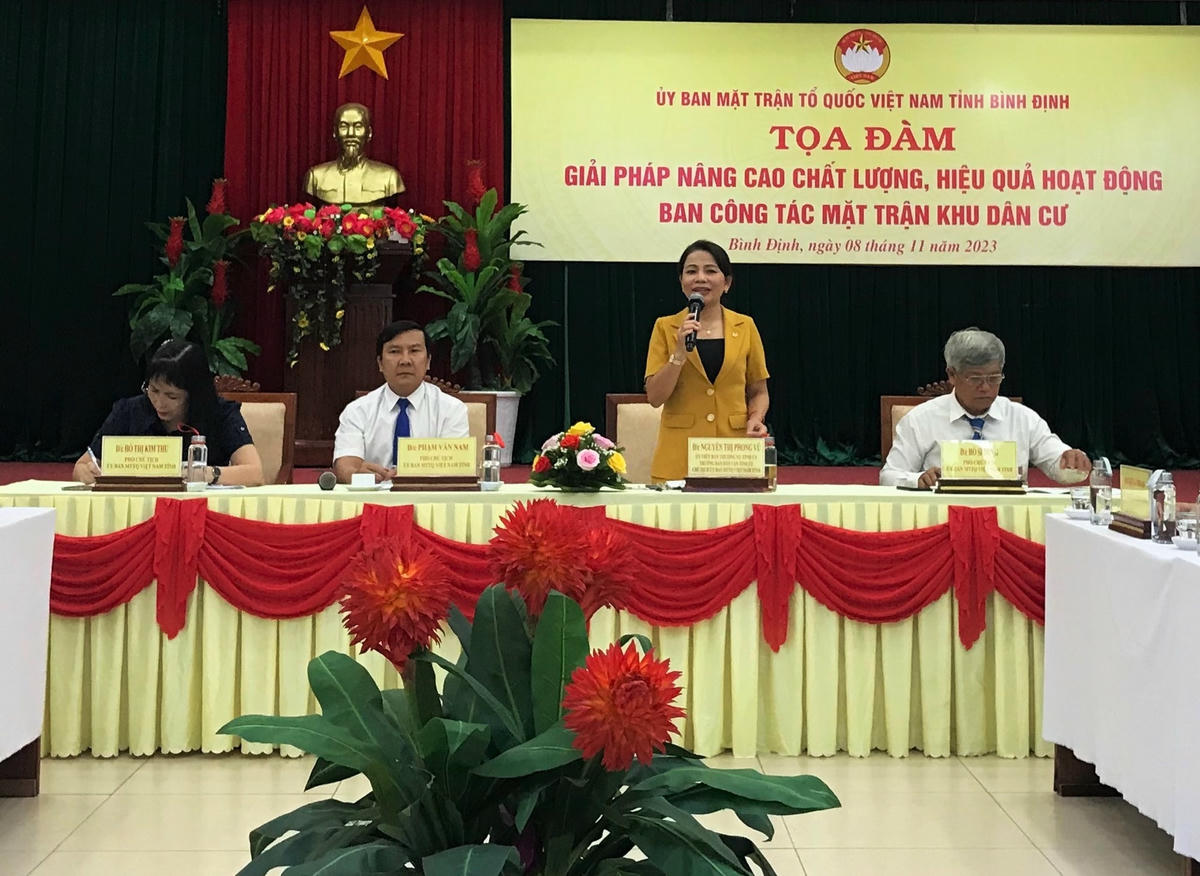 Phát biểu kết luận Tọa đàm, Ủy viên Ban Thường vụ Tỉnh ủy, Trưởng Ban Dân vận Tỉnh ủy, Chủ tịch Ủy ban MTTQ Việt Nam tỉnh Bình Định Nguyễn Thị Phong Vũ đề nghị MTTQ Việt Nam các cấp và Ban Công tác Mặt trận khu dân cư triển khai thực hiện tốt một số giải pháp nhằm nâng cao chất lượng hoạt động Ban công tác Mặt trận khu dân cư trong thời gian tới. Tiếp tục đổi mới phương thức tổ chức, hoạt động thường xuyên; tổ chức bồi dưỡng cập nhật kiến thức mới, tình hình mới cho đội ngủ cán bộ là Ban Công tác Mặt trận khu dân cư, đồng thời chú trọng công tác khen thưởng, biểu dương những gương điển hình và nhân rộng mô hình hay, cách làm tốt tại địa phương.