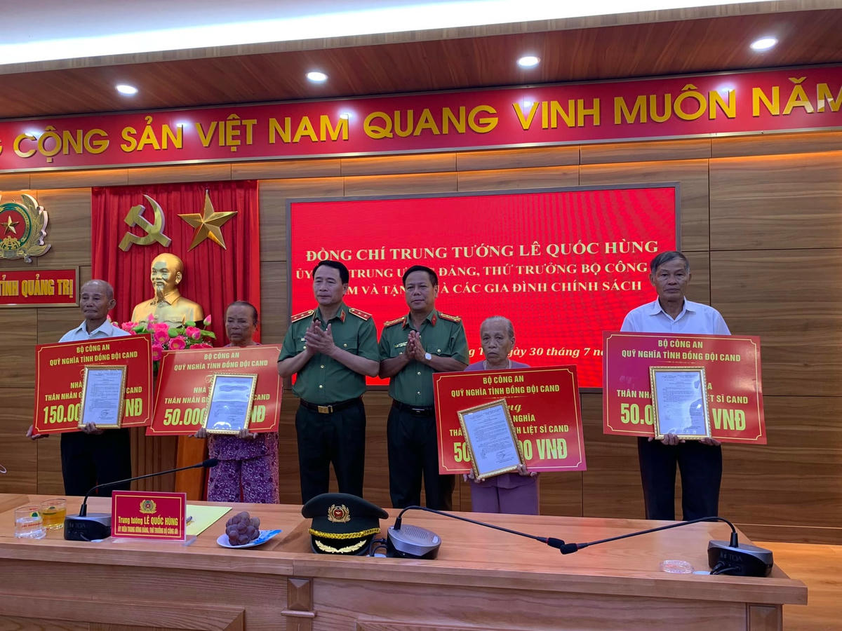Đồng thời, Thứ trưởng Lê Quốc Hùng đã trao tặng kinh phí 150 triệu đồng trích từ Quỹ "Nghĩa tình đồng đội" của Bộ Công an xây mới nhà tình nghĩa cho ông Nguyễn Hán (thân nhân gia đình liệt sĩ Công an Nhân dân, tại xã Triệu Long, huyện Triệu Phong); trao tặng kinh phí hỗ trợ sửa chữa nhà tình nghĩa, mỗi nhà 50 triệu đồng cho các gia đình thân nhân liệt sĩ Công an Nhân dân tại huyện Hải Lăng, gồm: bà Phan Thị Chót (xã Hải An), bà Phan Thị Bơm (xã Hải Sơn) và ông Lê Văn Quảng (xã Hải Chánh).