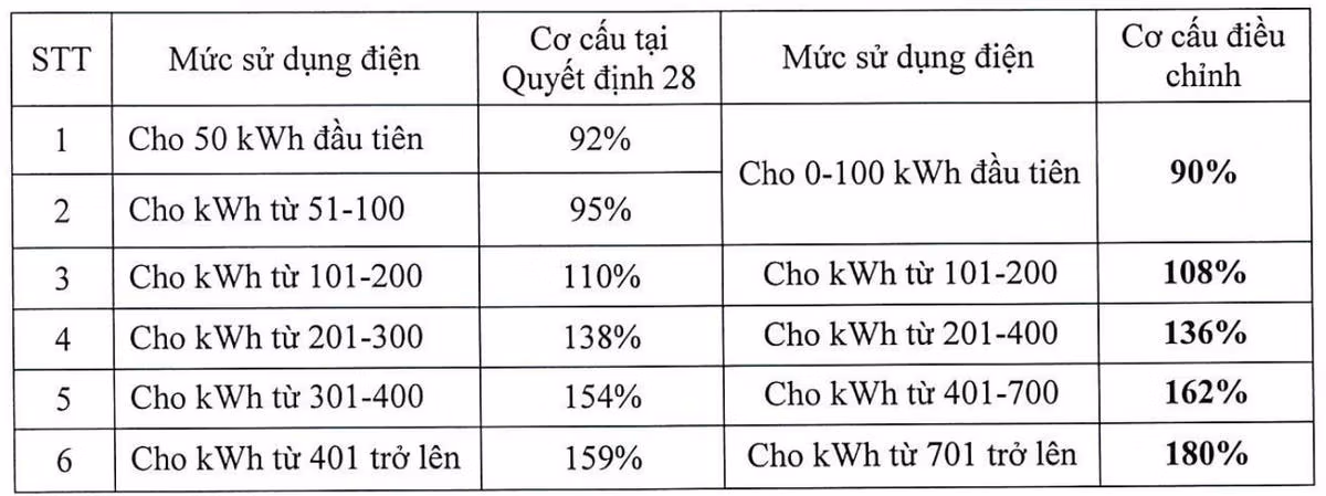 Trên cơ sở thiết kế các bậc nêu trên, Bộ Công Thương muốn giữ nguyên giá điện hiện hành cho bậc đầu từ 0-100 kWh nhằm đảm bảo ổn định giá điện cho các hộ nghèo, hộ chính sách xã hội có mức sử dụng điện thấp (chiếm 33,48% số hộ). Phần chênh lệch giảm doanh thu tiền điện được bù đắp từ hộ sử dụng điện từ 401-700 kWh và trên 700 kWh.