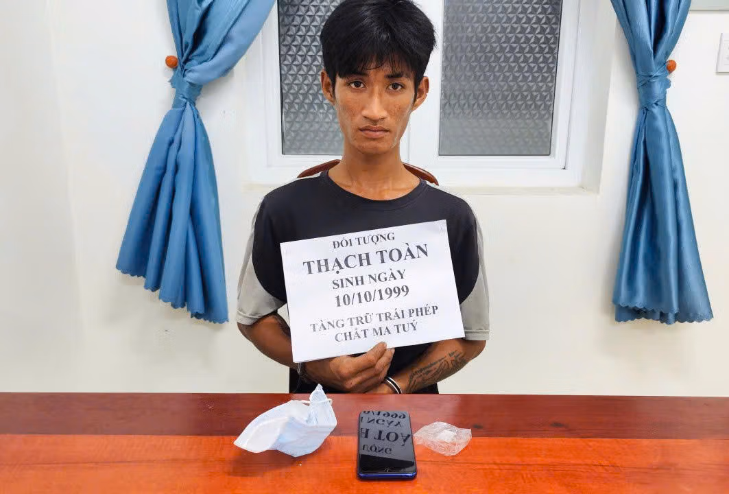 Tại hiện trường, lực lượng chức năng thu giữ một gói nilon màu trắng, được hàn kín, bên trong chứa tinh thể trong suốt, có trọng lượng 0,3 gram. Qua đấu tranh khai thác, đối tượng Thạch Toàn khai nhận đó là ma túy tổng hợp dạng đá được Toàn mua về để sử dụng (chưa kịp sử dụng thì bị bắt quả tang).