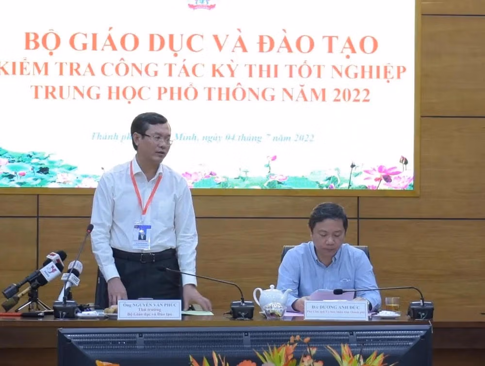 Ngày 4/7, Thứ trưởng Bộ Giáo dục và Đào tạo (GDĐT) Nguyễn Văn Phúc dẫn đầu đoàn đã đến kiểm tra công tác chuẩn bị Kỳ thi tốt nghiệp THPT năm 2022 tại TP HCM và dự hội nghị kiểm tra trực tuyến tại Bà rịa - Vũng Tàu.