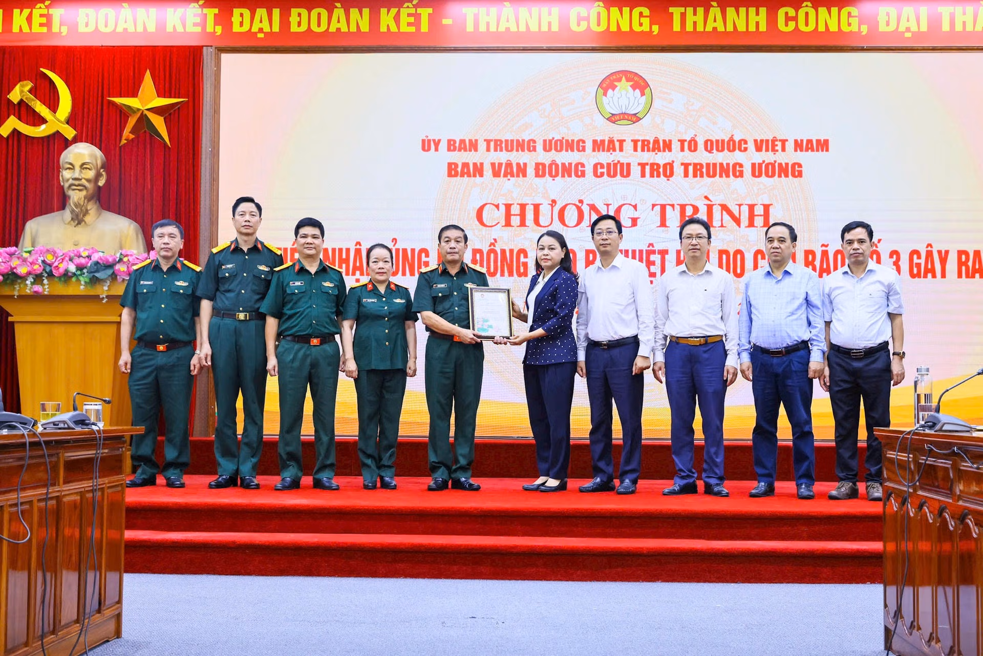 Trân trọng cảm ơn những đóng góp, hy sinh to lớn của Quân đội nhân dân Việt Nam và lực lượng vũ trang nói chung, Phó Chủ tịch - Tổng Thư ký Nguyễn Thị Thu Hà cam kết số tiền ủng hộ sẽ được chuyển đến các địa phương theo đề xuất của Bộ Quốc phòng, với tinh thần phân bổ nhanh nhất, kịp thời nhất để cùng với cấp ủy, chính quyền ở địa phương giúp bà con nhân dân sớm khắc phục thiệt hại, khôi phục sản xuất, ổn định đời sống.