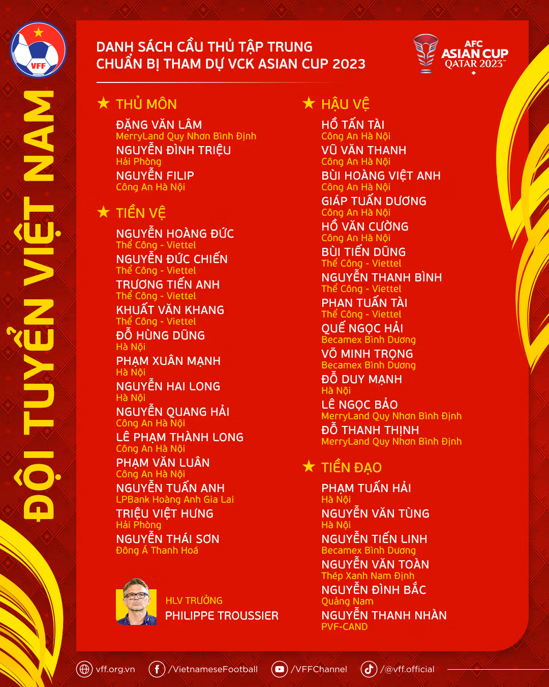Theo tin từ Liên đoàn bóng đá Việt Nam, nhằm đảm bảo tối đa lực lượng cho đội tuyển Việt Nam chuẩn bị tham dự VCK Asian Cup 2023, HLV Philippe Troussier đã quyết định bổ sung hậu vệ Bùi Tiến Dũng và Hồ Tấn Tài vào danh sách tập trung của đội tuyển. Bộ đôi hậu vệ này lên hội quân cùng các đồng đội trong ngày hôm nay (31/12).