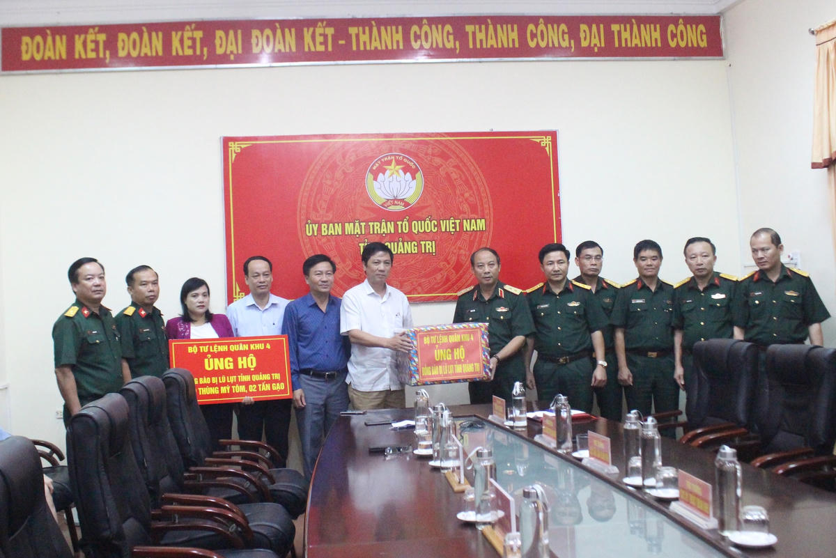 Theo đó, thông qua Ủy ban MTTQ Việt Nam tỉnh,Trung tướng Trần Võ Dũng, Bí thư Đảng ủy, Chính ủy Quân khu 4 đã trao tặng 1.200 thùng mỳ tôm, 2 tấn gạo đến với người dân trên địa bàn tỉnh Quảng Trị bị ảnh hưởng bởi mưa bão.