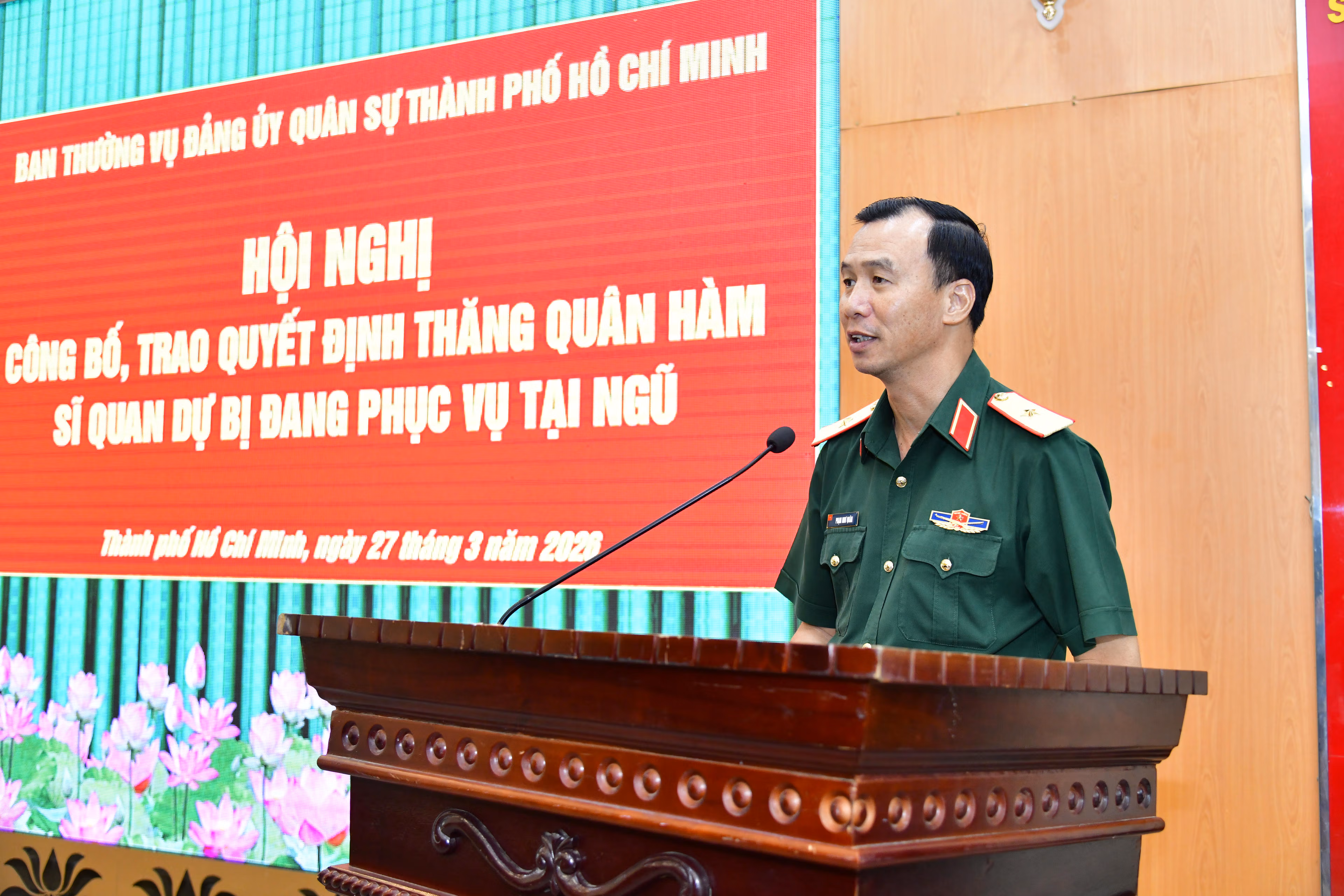 Sáng 27/3, Ban Thường vụ Đảng ủy Quân sự TP Hồ Chí Minh tổ chức Hội nghị công bố, trao quyết định thăng quân hàm sĩ quan dự bị đang phục vụ tại ngũ. Dự và chủ trì có Thiếu tướng Phạm Như Quân, Phó Chính ủy Bộ Tư lệnh TP Hồ Chí Minh.