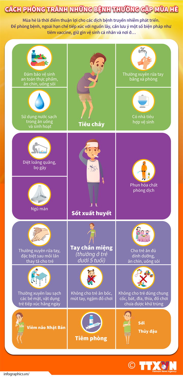 Mùa hè nắng nóng, các bệnh lây truyền qua đường hô hấp, đường tiêu hóa như Covid-19, sởi, cúm, tay chân miệng, tiêu chảy do virus Rota...; các bệnh do muỗi truyền như sốt xuất huyết, viêm não do virus… thường có nguy cơ gia tăng số mắc và có thể bùng phát dịch bệnh.