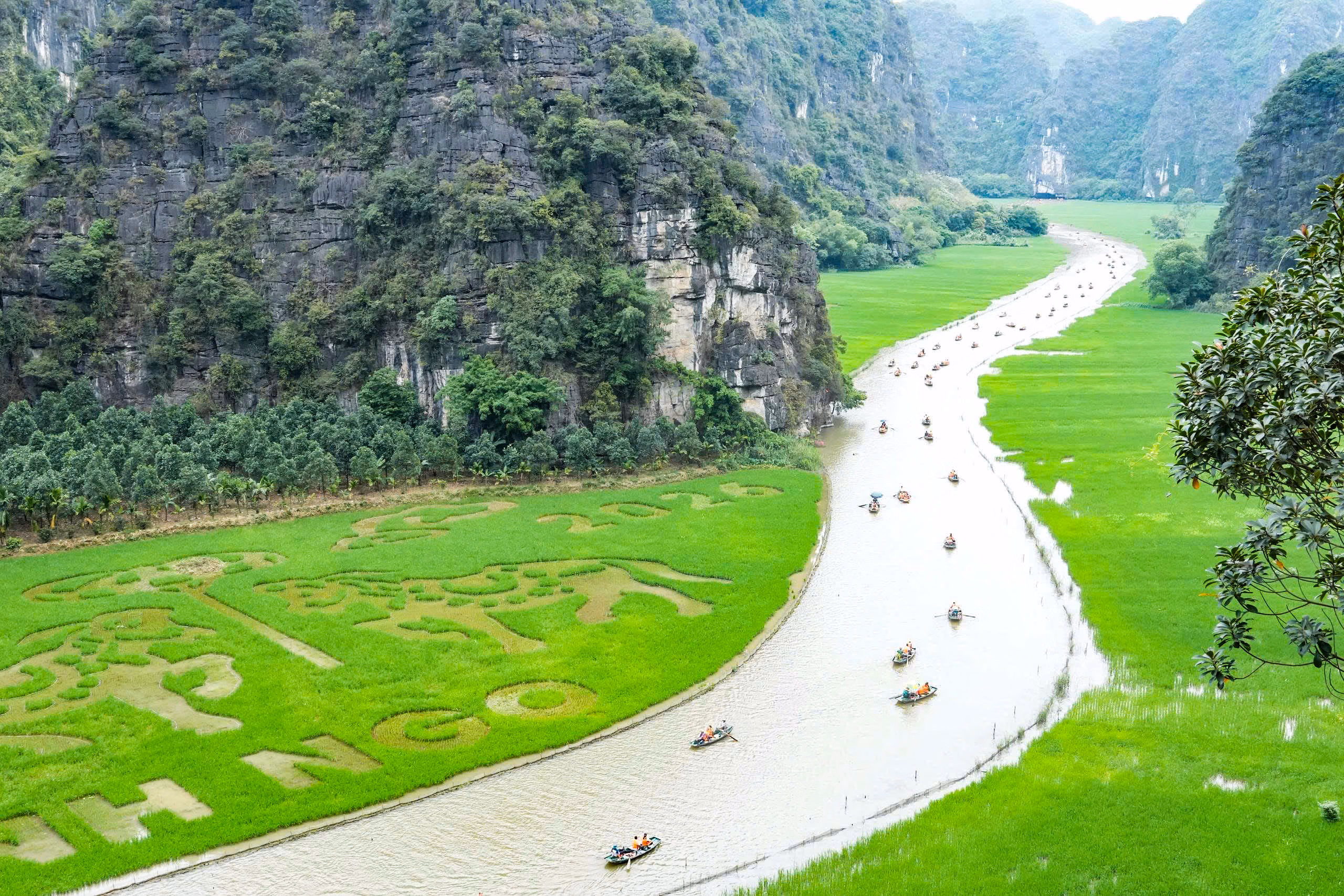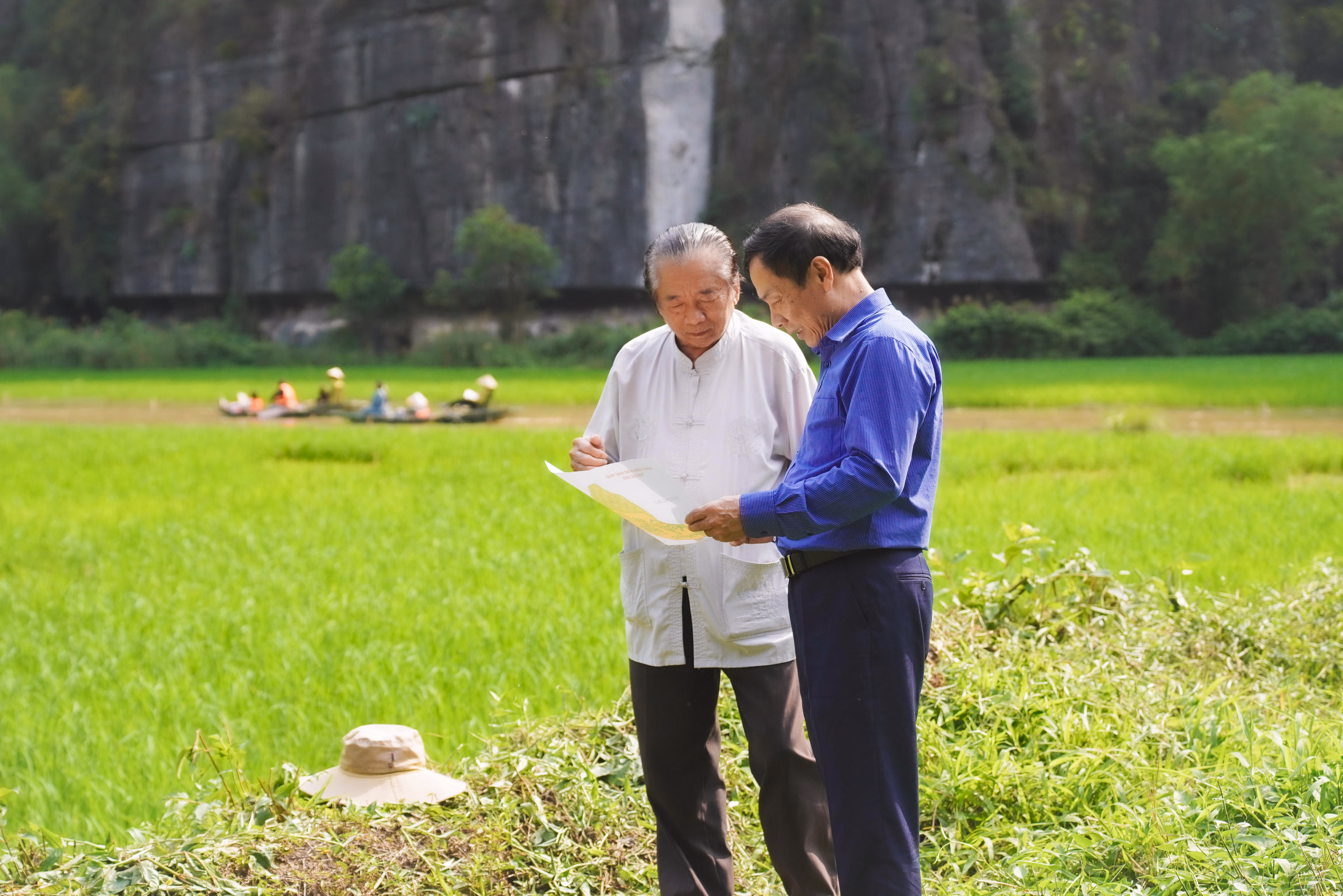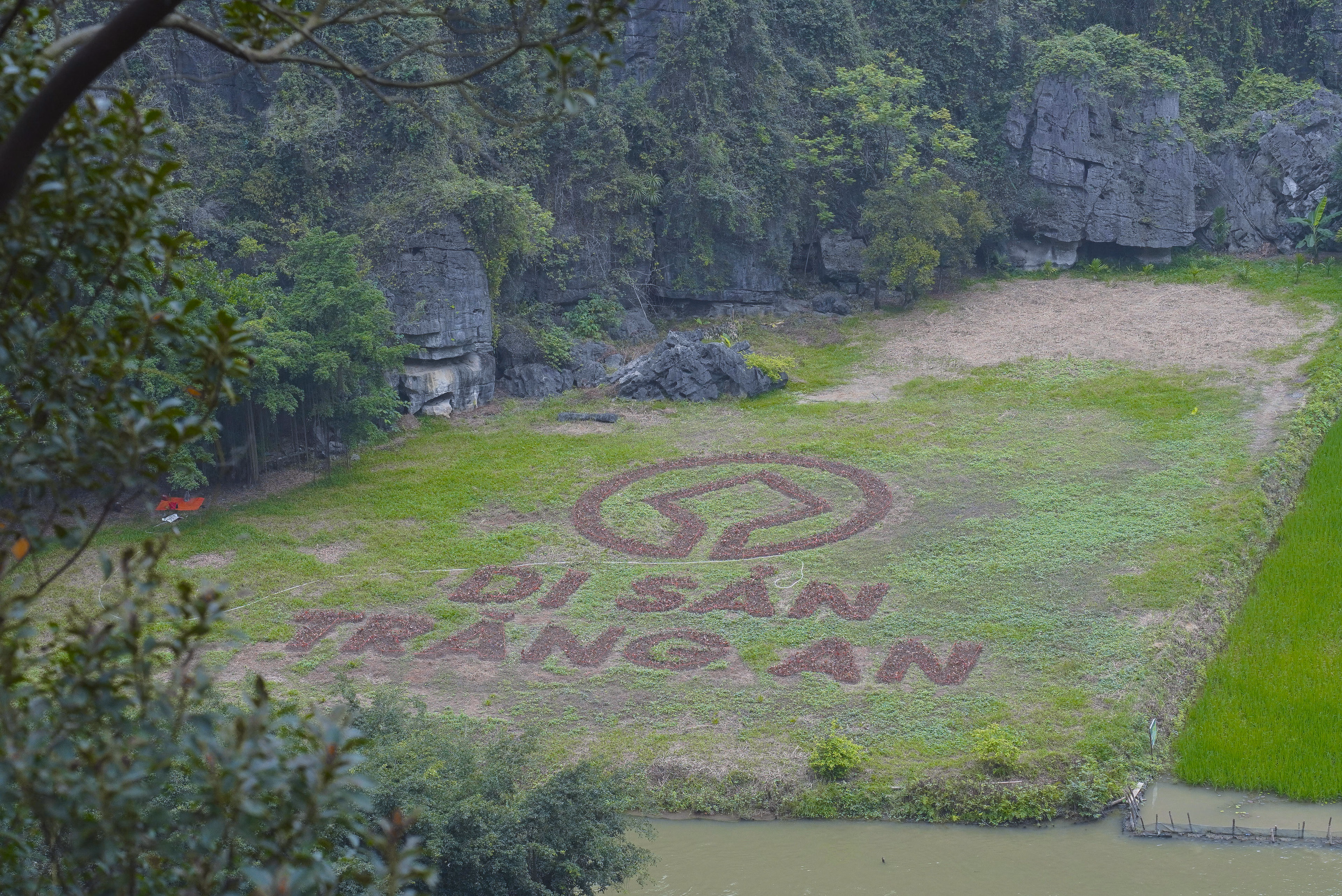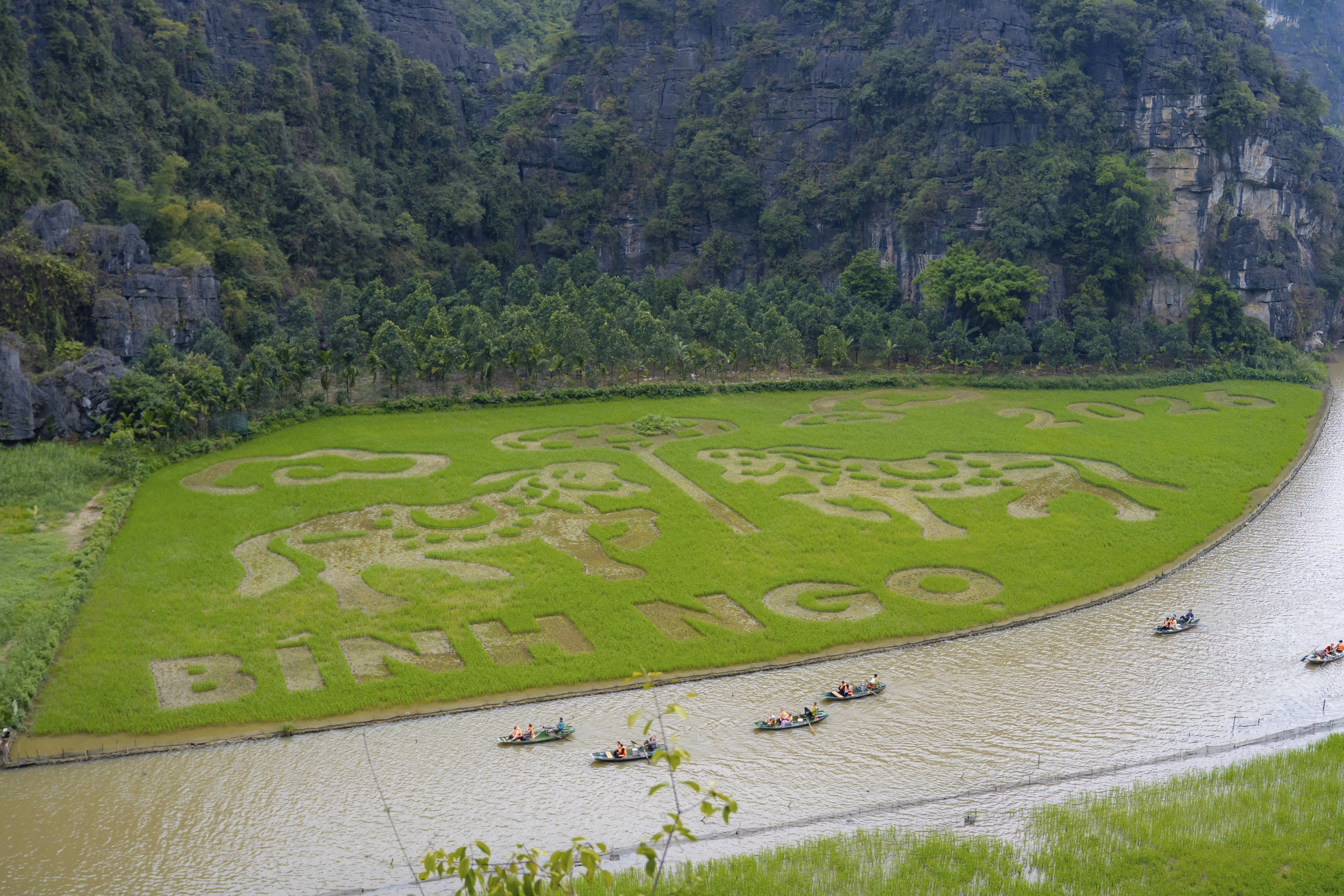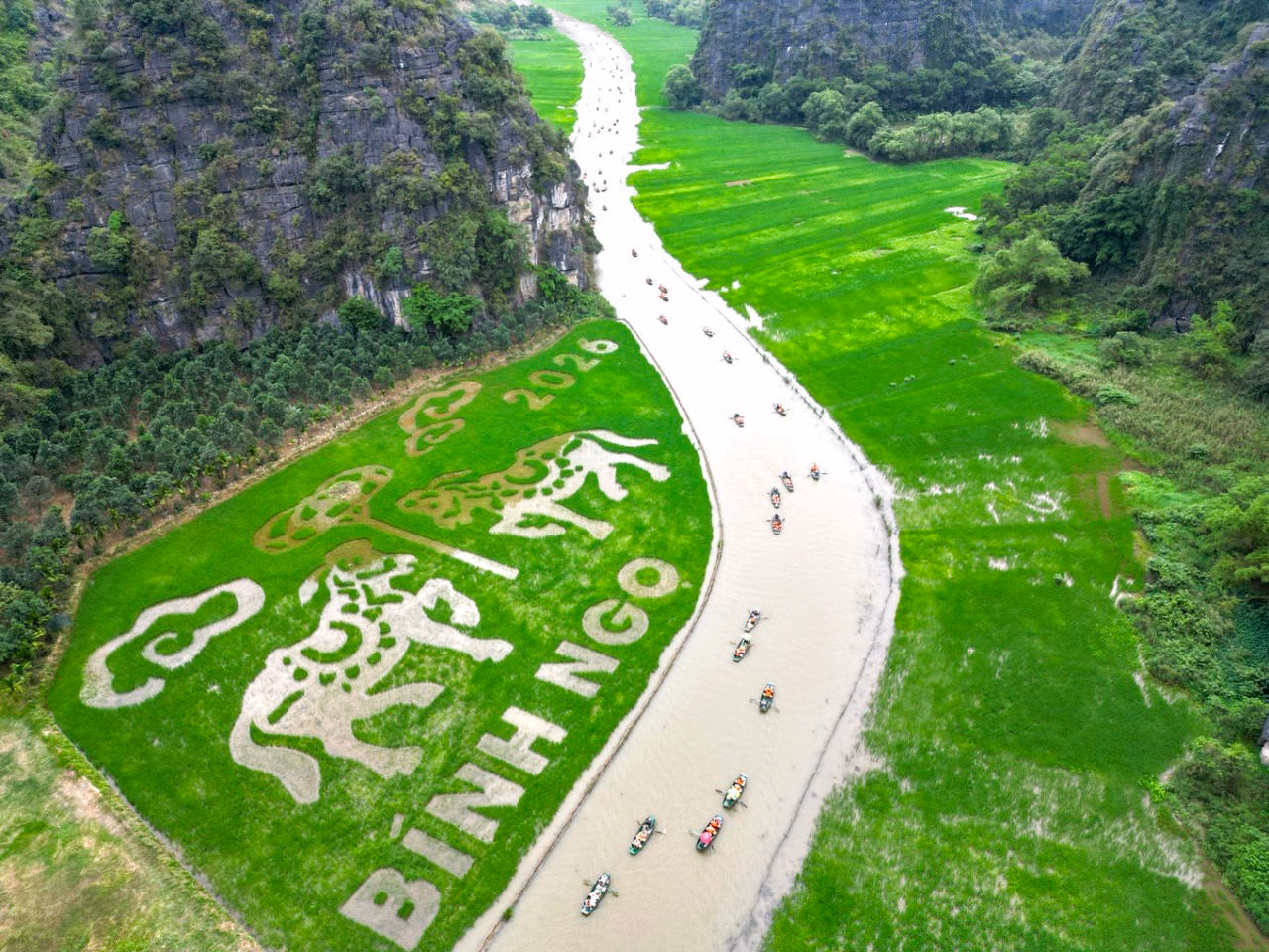 Bức tranh 'song mã chầu báo công' giữa cánh đồng đẹp bậc nhất Việt Nam Thứ Ba 07/04/2026 10:53 (GMT+7) Trên nền cánh đồng Tam Cốc nổi tiếng, hình ảnh 'song mã chầu báo công' hiện lên rõ nét trong mùa lúa chín, trở thành điểm nhấn đặc sắc của du lịch Ninh Bình năm 2026. Giữa không gian non nước hữu tình tại khu vực Tam Cốc, nơi được mệnh danh là một trong những cánh đồng lúa đẹp nhất Việt Nam, bức tranh 'song mã chầu báo công' hiện lên sống động, trở thành điểm nhấn độc đáo của mùa lúa chín năm nay. Ảnh: Đình Minh.Theo Sở Du lịch tỉnh Ninh Bình, cánh đồng nghệ thuật năm nay được tạo hình trên diện tích khoảng 10.000 m2, sử dụng kỹ thuật gieo cấy nhiều giống lúa khác nhau tạo nên bức tranh khổng lồ giữa thiên nhiên. Ảnh: Đình Minh.Hình tượng 'song mã chầu báo công' được lựa chọn với ý nghĩa biểu trưng cho tinh thần khát vọng vươn lên, sự bền bỉ, đoàn kết và phát triển, đồng thời cũng là biểu tượng của năm 2026, năm Bính Ngọ. Ảnh: Đình Minh.Họa sĩ Phúc Khôi (bên trái), người trực tiếp tham gia thiết kế tác phẩm cho biết, chủ đề của tác phẩm được lấy cảm hứng từ 4 câu thơ 'Mừng thắng lợi năm Tỵ, Song mã chầu báo công, Đón năm Ngọ ngựa hí, Chúc mã đáo thành công'. Ảnh: Đình Minh.Theo ghi nhận của PV Báo Đại Đoàn kết thời điểm cuối tháng 3/2026, tranh thủ thời tiết thuận lợi, bà con nông dân tổ dân phố Văn Lâm, phường Nam Hoa Lư ra thửa ruộng nghệ thuật trên cánh đồng lúa Tam Cốc dặm lại những cây lúa bị chết. Ảnh: Đình Minh.Các công việc như làm cỏ, bón phân, trừ sâu bệnh cũng được chú trọng để đảm bảo cho cây lúa sinh trưởng, phát triển tốt. Ảnh: Đình Minh.Việc tạo hình nghệ thuật trên cánh đồng lúa thay đổi qua từng năm đã khẳng định tư duy đổi mới của du lịch Ninh Bình. Tam Cốc giờ đây không chỉ mang vẻ đẹp hoang sơ mà còn là một tác phẩm nghệ thuật, nơi thiên nhiên và con người cùng nhau viết nên những bản hùng ca di sản. Ảnh: Đình Minh.Tạo hình được thiết kế công phu, cân đối giữa yếu tố nghệ thuật và điều kiện canh tác, bảo đảm khi lúa phát triển theo từng giai đoạn sẽ dần hiện rõ bức tranh sống động, thu hút du khách tham quan, chụp ảnh. Ảnh: Đình Minh.Bức tranh 'song mã chầu báo công' trên cánh đồng lúa Tam Cốc. Video: Đình Minh. Đình Minh