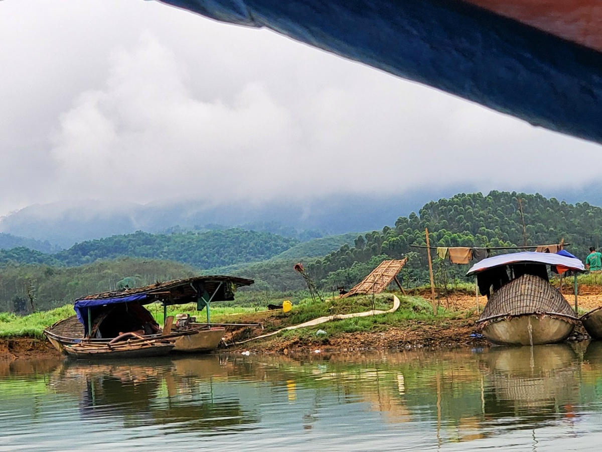Nhưng vài năm trở lại đây, lòng hồ lại bắt đầu dậy sóng. Những ngày tháng cuối năm, chúng tôi thuê một người dân địa phương chở xuồng máy lượn xung quanh hồ. Quanh nhiều điểm đảo là những vết sạt lở do khai thác đá quý, có những đường dây điện kéo từ lâu, một số máy tời, máy đào đất cũ kĩ bị vứt bỏ lại. Sau đóm chúng tôi ngược lòng hồ lên khu vực Cẩm Ân.