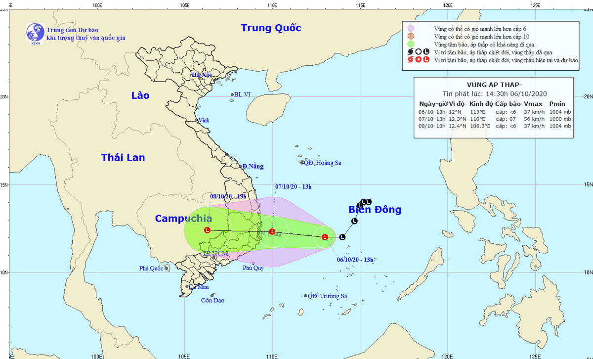 Theo Trung tâm Dự báo Khí tượng thủy văn quốc gia, hồi 13h ngày 6/10, vị trí trung tâm vùng áp thấp ở vào khoảng 11,5-12,5 độ Vĩ Bắc; 112,5-113,5 độ Kinh Đông, cách đảo Song Tử Tây khoảng 160 km về phía Tây Tây Bắc.