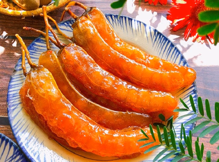 Mứt me sau khi làm xong có mùi thơm, thịt trong, dẻo, vị chua chua ngọt ngọt, ăn là ghiền.