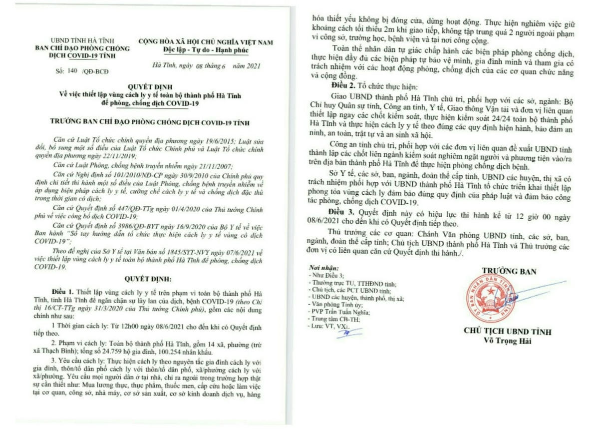 Theo đó, thời gian cách ly từ 12h00 ngày 08/6/2021 cho đến khi có quyết định tiếp theo. Phạm vi cách ly là toàn bộ thành phố Hà Tĩnh, gồm 15 xã, phường. Tổng số 25.516 hộ gia đình, 103.546 nhân khẩu.