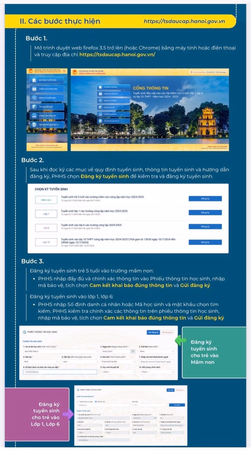 Để thực hiện đăng ký tuyển sinh trực tuyến vào lớp 1, phụ huynh truy cập trang: https://tsdaucap.hanoi.gov.vn, sau đó làm theo các bước hướng dẫn.