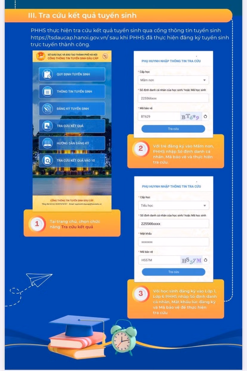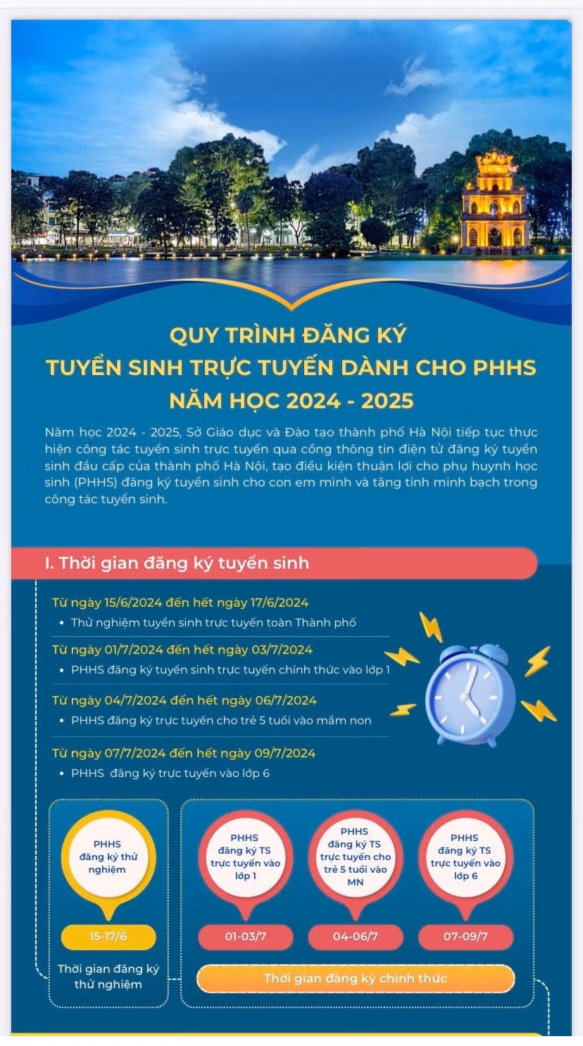 Trước đó, từ ngày 15/6 đến hết ngày 17/6, Sở GDĐT Hà Nội đã vận hành thử nghiệm hệ thống tuyển sinh đầu cấp để phụ huynh học sinh làm quen; chỉ đạo các đơn vị chuẩn bị cơ sở vật chất, nhân sự vận hành chính thức hệ thống tuyển sinh trực tuyến từ ngày 1/7.