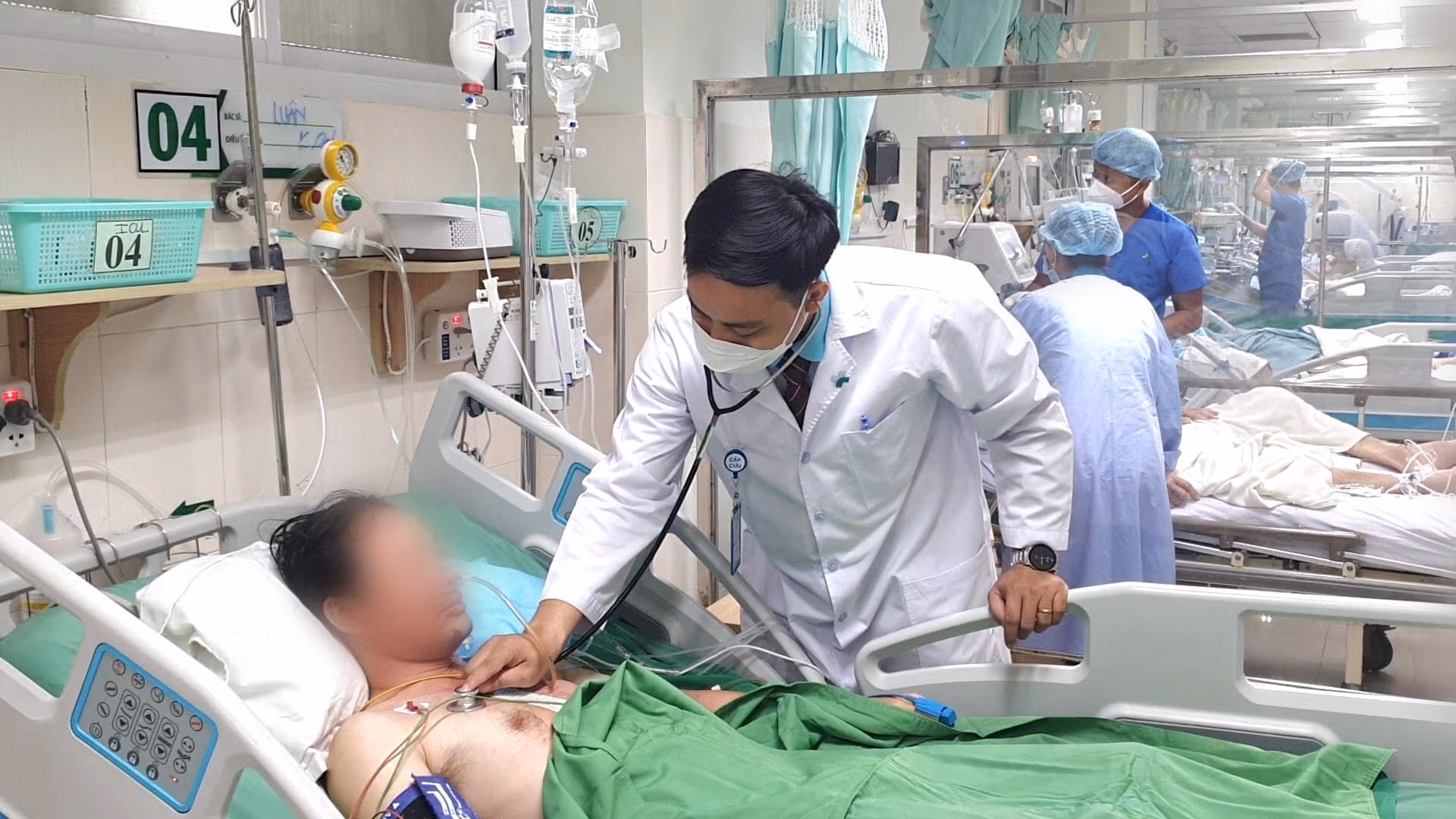 Tại đây, các bác sĩ khoa Cấp cứu nhanh chóng kích hoạt Code Blue tim toàn viện (Quy trình báo động toàn viện để cấp cứu người bệnh ngưng tim ngưng thở) tiến hành cấp cứu cho người bệnh. Trong quá trình cấp cứu, người bệnh xuất hiện những cơn rối loạn nhịp tim nguy hiểm phải tiến hành sốc điện khử rung nhiều lần.