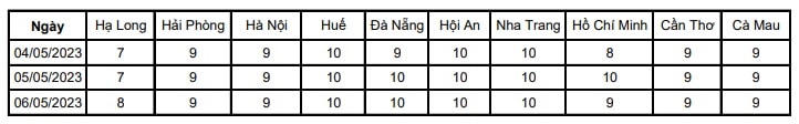 Ngoài ra, theo Trung tâm, trong ngày hôm nay, chỉ số UV cao nhất trong ngày tại các thành phố Hạ Long, Hải Phòng, Hà Nội ở ngưỡng nguy cơ gây hại cao, các thành phố còn lại ở ngưỡng nguy cơ gây hại rất cao. Trong ba ngày tiếp theo, chỉ số UV cao nhất trong ngày tại thành phố Hạ Long ở ngưỡng nguy cơ gây hại cao (7-8), các thành phố còn lại duy trì ở ngưỡng nguy cơ gây hại rất cao (9-10).