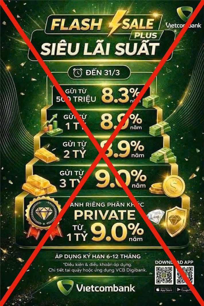 Hiện nay, trên các nền tảng mạng xã hội như Facebook, Zalo, đang xuất hiện tình trạng nhiều tài khoản chia sẻ các ấn phẩm truyền thông (poster, hình ảnh) giả mạo chương trình lãi suất của Vietcombank. Đây là thủ đoạn hết sức tinh vi nhằm chiếm thông tin của khách hàng, cụ thể: