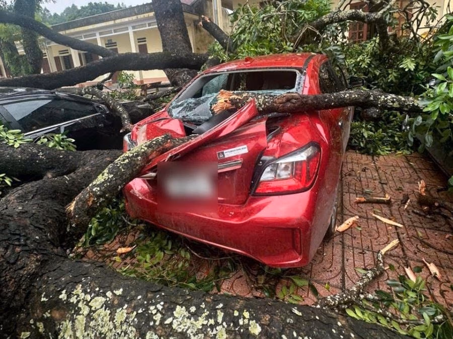 Do ảnh hưởng của mưa bão, cành cây xà cừ trong sân trường ở Thanh Hóa đã gãy đổ khiến 1 cô giáo bị thương, 4 xe ô tô bị hư hỏng nặng.