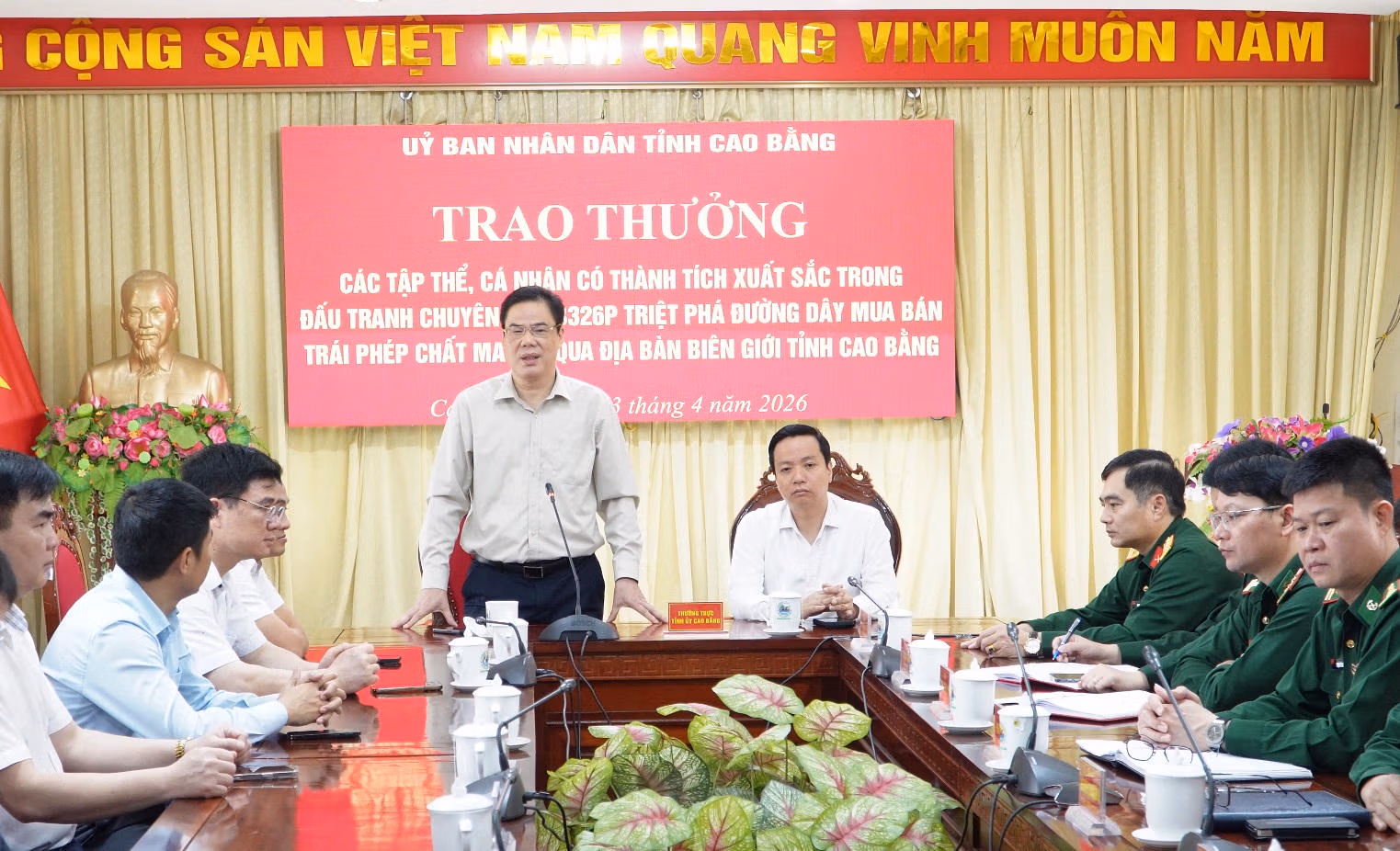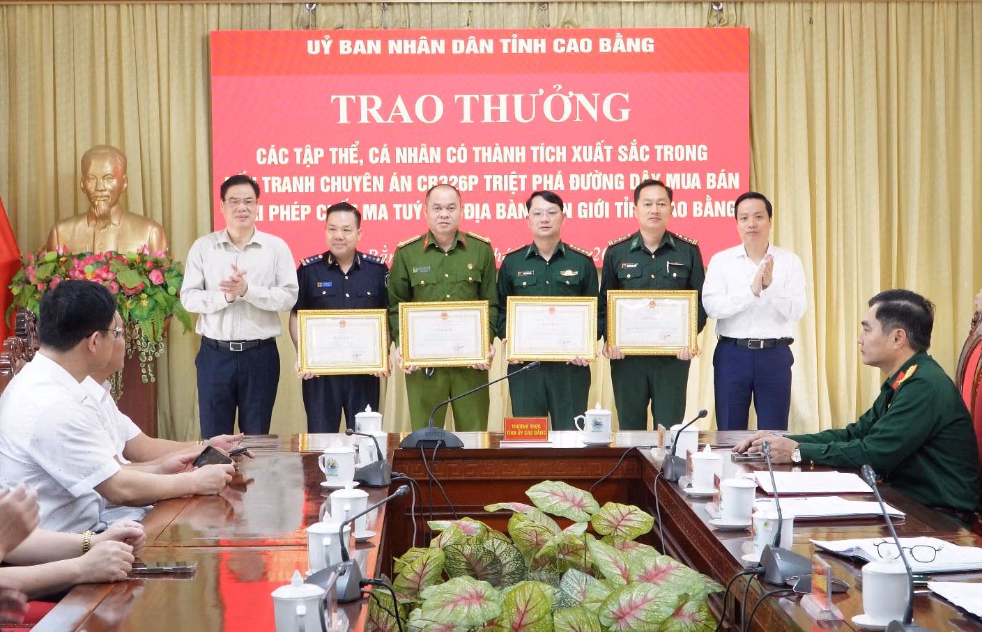 Chủ tịch UBND tỉnh Cao Bằng Lê Hải Hòa trao bằng khen cho lực lượng Bộ đội Biên phòng trong Chuyên án CB326p, bắt giữ đối tượng vận chuyển 9 bánh heroin qua biên giới, ghi dấu ấn mạnh trong công tác phòng chống tội phạm.