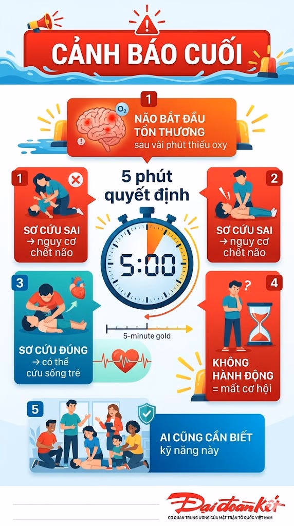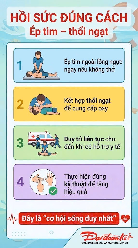Khi tiến hành cấp cứu tại chỗ cho trẻ đuối nước có ngừng tim, việc ép tim, thổi ngạt đúng cách là biện pháp cấp cứu quan trọng và hiệu quả nhất, giúp trẻ qua cơn nguy kịch, tránh để lại những hậu quả nặng nề. Các bác sĩ tại Bệnh viện Nhi Trung ương nhấn mạnh, tuyệt đối không được dốc ngược chạy, vì điều này có thể làm mất cơ hội vàng cứu sống trẻ.