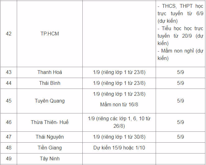 Theo đó, Sở Giáo dục và Đào tạo TP Hồ Chí Minh đề xuất thành phố không tổ chức tựu trường, các trường sẽ bắt đầu tổ chức dạy học trực tuyến với thời điểm như sau: Các trường THCS, THPT sẽ tổ chức hướng dẫn học sinh kỹ năng, phương pháp học trên internet từ ngày 1-5/9. Ngày 6/9 sẽ bắt đầu giảng dạy theo chương trình năm học mới. Các trường tiểu học sẽ tổ chức hướng dẫn học sinh kỹ năng, phương pháp học trên internet từ ngày 8-19/9. Bắt đầu từ ngày 20/9 thực hiện giảng dạy theo chương trình năm học. Các trường mầm non sẽ khai giảng chậm hơn, khi tình hình dịch Covid-19 được kiểm soát, học sinh có thể đến trường.