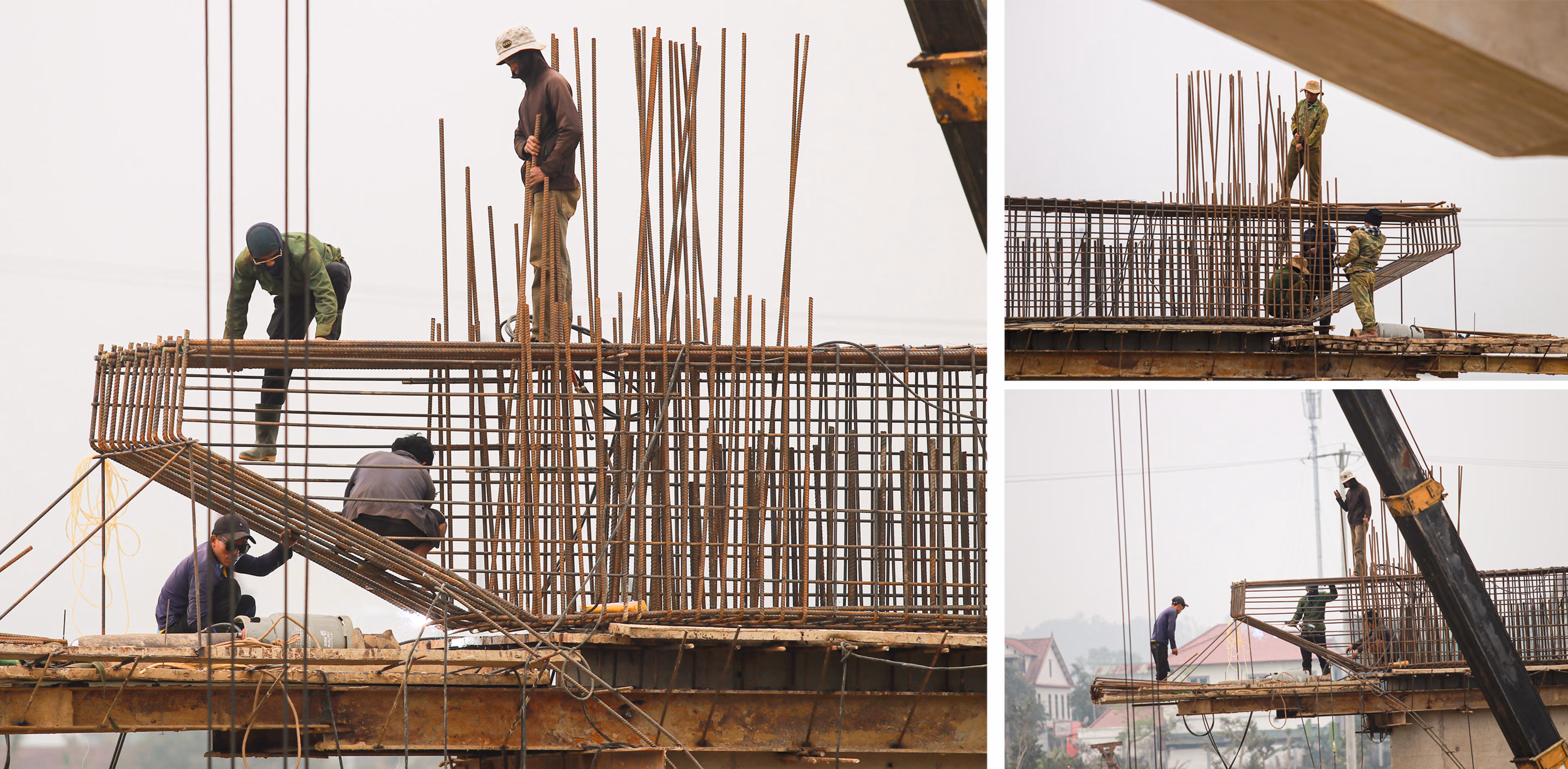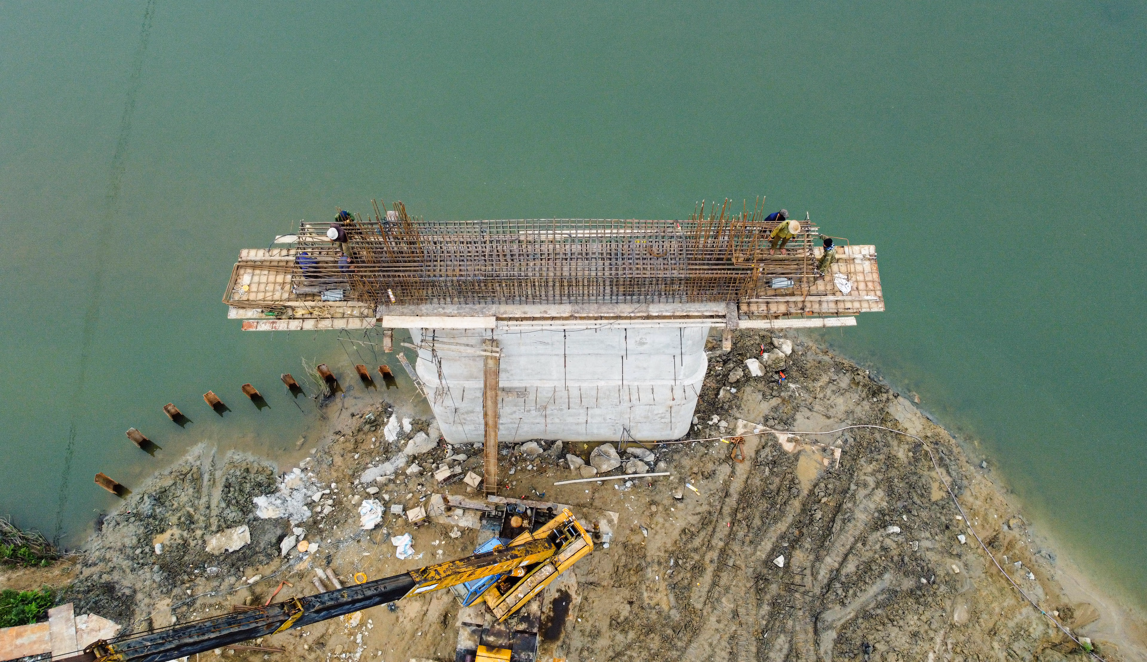Để hạn chế ảnh hưởng của mưa lũ, nhà thầu đã bố trí thi công theo ca, tăng cường nhân lực và thiết bị trong các khung thời gian bảo đảm an toàn. Hiện, trên công trường có khoảng 40 cán bộ, kỹ sư và công nhân, làm việc luân phiên theo từng hạng mục, tập trung vào thi công phần dưới trụ cầu và đúc, lắp dầm.
