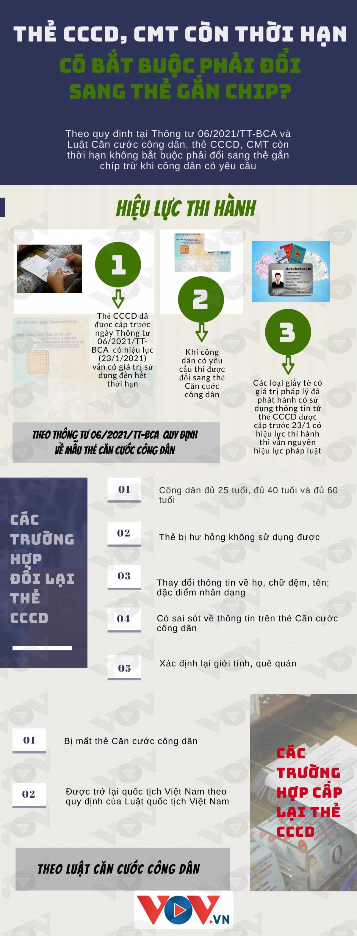 CCCD, CMT còn thời hạn có bắt buộc phải đổi sang thẻ gắn chip? Thứ Bảy 13/03/2021 08:56 (GMT+7) Theo quy định tại Thông tư 06/2021/TT-BCA và Luật Căn cước công dân, thẻ CCCD, CMT còn thời hạn không bắt buộc phải đổi sang thẻ gắn chíp trừ khi công dân có yêu cầu...